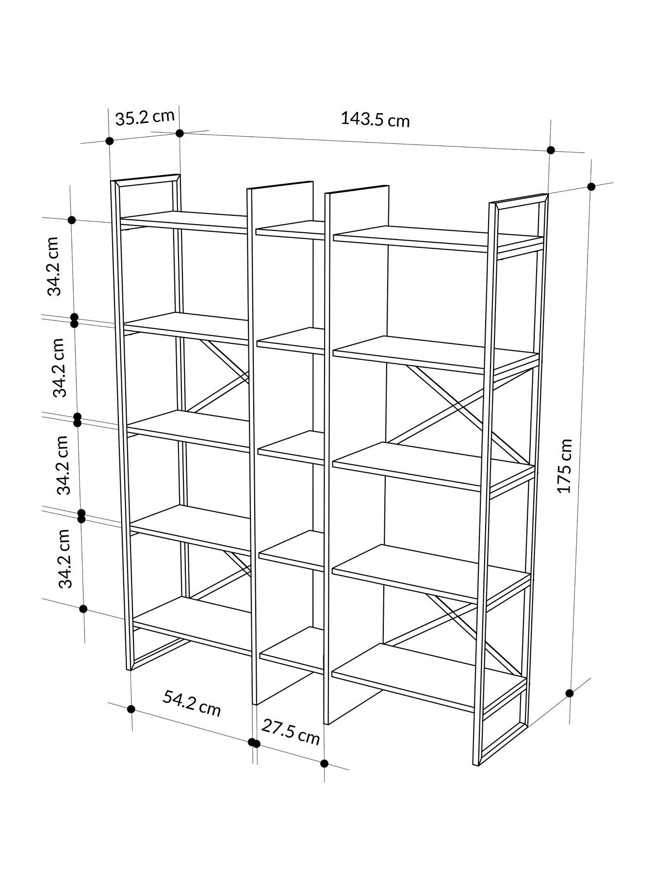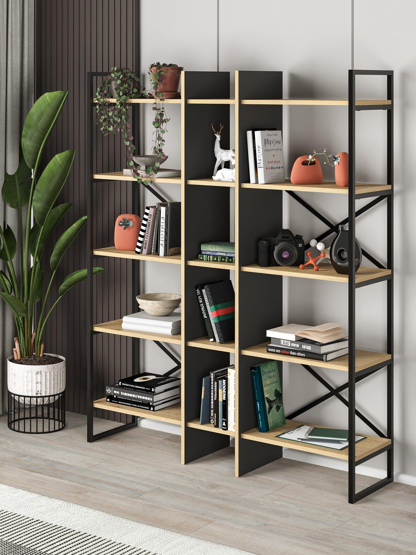 Decortie Detroit Bookcase - Oak/blackOrganise your home in style with the Detroit Industrial Bookcase. This tall, wide shelving unit is a statement piece for any modern living room or home office. Standing 175cm high and 143.5cm wide, its 5-tier design provides ample space for books, decor, and storage. The combination of rustic oak-effect shelves and a sturdy black metal frame delivers a popular industrial aesthetic, perfect for contemporary interiors. Use this versatile unit as a bookcase, a display shelf, or a general storage shelf. The cross-back design not only adds to the industrial charm but also enhances the structure's stability. This tall bookcase and shelving unit is a must-have for anyone looking for functional, stylish storage.