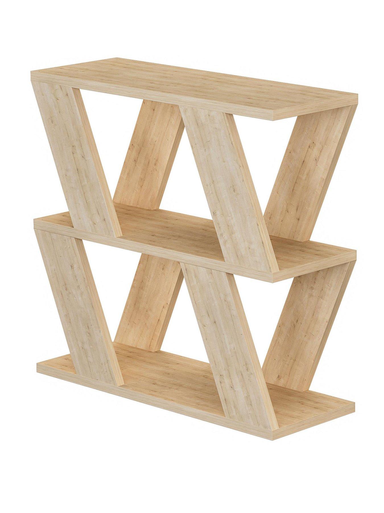 Decortie Lazena Sofa Side Table - Oak EffectA best-seller by Decortie, this Lazena freestanding side table is perfect for sitting next to a sofa or armchair, giving you a mix of display space as well as a handy area to sit that all-important cuppa!The modern design features an oak-effect finish, plus eye-catching criss-crossing supports. Two shelves are great for books, ornaments and other decorative faves. The 60 cm width also provides plenty of room to perch remotes, your phone and more while binge watching your latest streaming series. Alternative colours are available separately. Please remember to measure your available space before ordering. Dimensions: Height 55.4, Width 60, Depth 21.2 cm