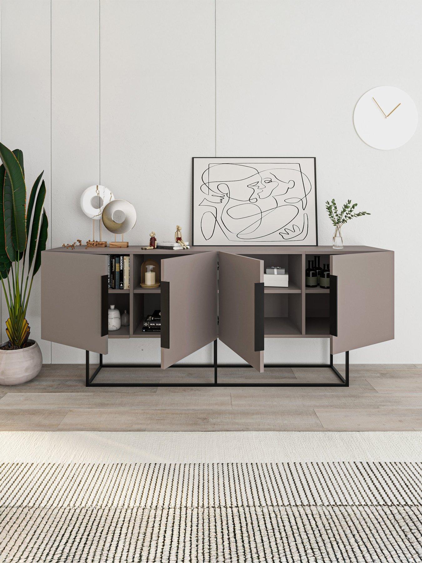 Decortie Tontini Large Sideboard - MochaGrand Storage and Modern Industrial Style: The Tontini 200cm Console Sideboard: Make a bold statement in your living or dining area with the Tontini Console Sideboard. This expansive storage solution combines contemporary aesthetics with industrial durability. Stretching to a generous 200cm width, this piece is designed for large-scale interiors, offering a sophisticated Mocha Grey finish that adds a refined, modern touch to your home. The Tontini is engineered for maximum organisation, featuring four doors that open to reveal eight separate compartments divided by four internal shelves. Each door is equipped with a premium soft-close mechanism, ensuring a silent and gentle operation that protects the unit from wear and tear. The design is accented by four minimalist black metal handles and a robust 30 cm metal frame base, providing an airy, elevated look that simplifies floor cleaning. Built to support a substantial amount of household essentials, this 53kg unit is crafted from high-quality materials to ensure long-lasting stability. Safety is central to the design, with an integrated wall-mounting system provided to secure the unit firmly and prevent tipping. Delivered in two protective packages, the Tontini includes a comprehensive assembly guide and all necessary tools for a straightforward setup.