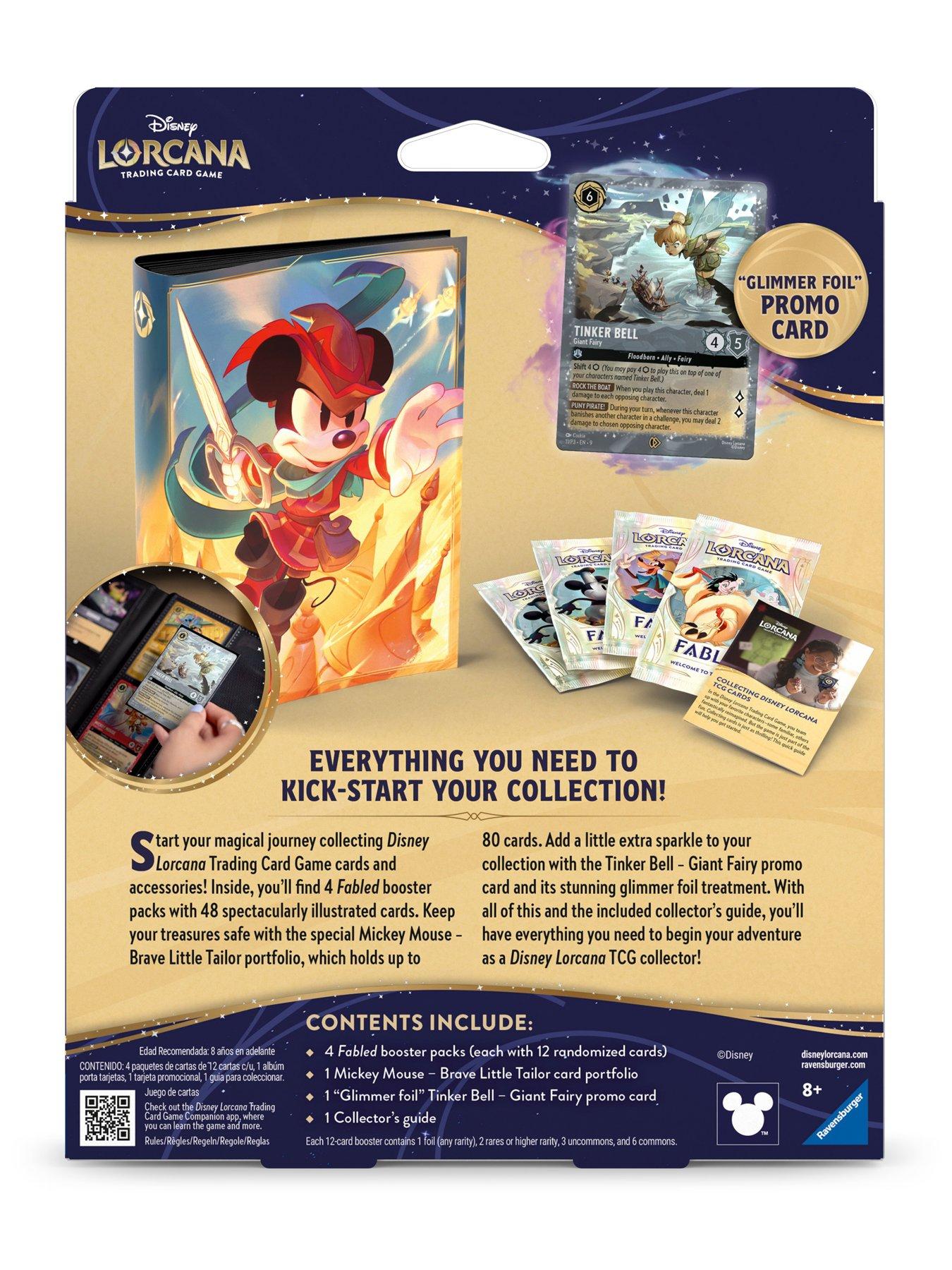 Disney Lorcana Collection Starter SetStart your magical journey collecting Disney LorcanaTrading Card Game cards and accessories! Inside, you'll find 4 Fabled booster packs with 48 spectacularly illustrated cards. Keep your treasures safe with the special Mickey Mouse - Brave Little Tailor portfolio that holds up to 80 cards. Add a little extra sparkle to your collection with the Tinker Bell - Giant Fairy promo card and its stunning glimmer foil treatment. With all of this and the included collector's guide, you'll have everything you need to begin your adventure as a Disney Lorcana TCG collector! The Collector Starter includes: - 4 Fabled booster packs, each with 12 randomized cards - 1 Mickey Mouse - Brave Little Tailor 4-pocket card portfolio - 1 'Glimmer foil' Tinker Bell - Giant Fairy promo card - 1 Collector's guide