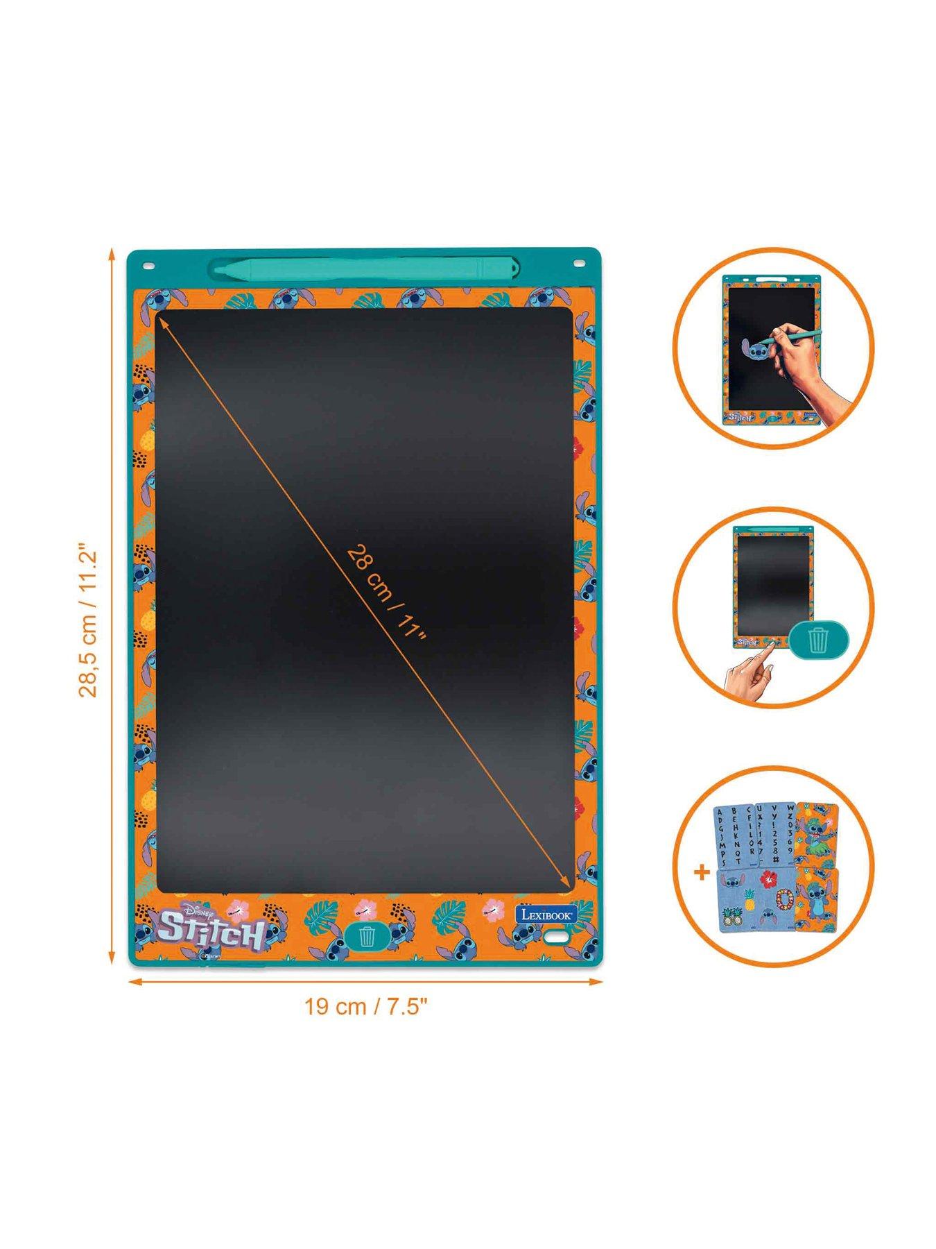 Disney Stitch Stitch 11'' multicolor learning drawing E-ink tablet with stencils"* Make writing, drawing and learning more fun with the Stitch E-ink Magic Tab! Pressure sensitive screen to adjust weight of the lines.* Ultra-thin, lightweight and durable design. Bring it with you everywhere you go: commute, restaurant, friends', etc. * Stencils included to learn how to draw and write! * A large 11' screen! * Unique erase content button! You can start other with one simple press. * An 'erase lock' prevents you from accidentally erasing your drawings! * Save paper! No more waste! * Stylus included with a storage area at the top of the tablet. * Battery provided - Ultra-low power consumption "