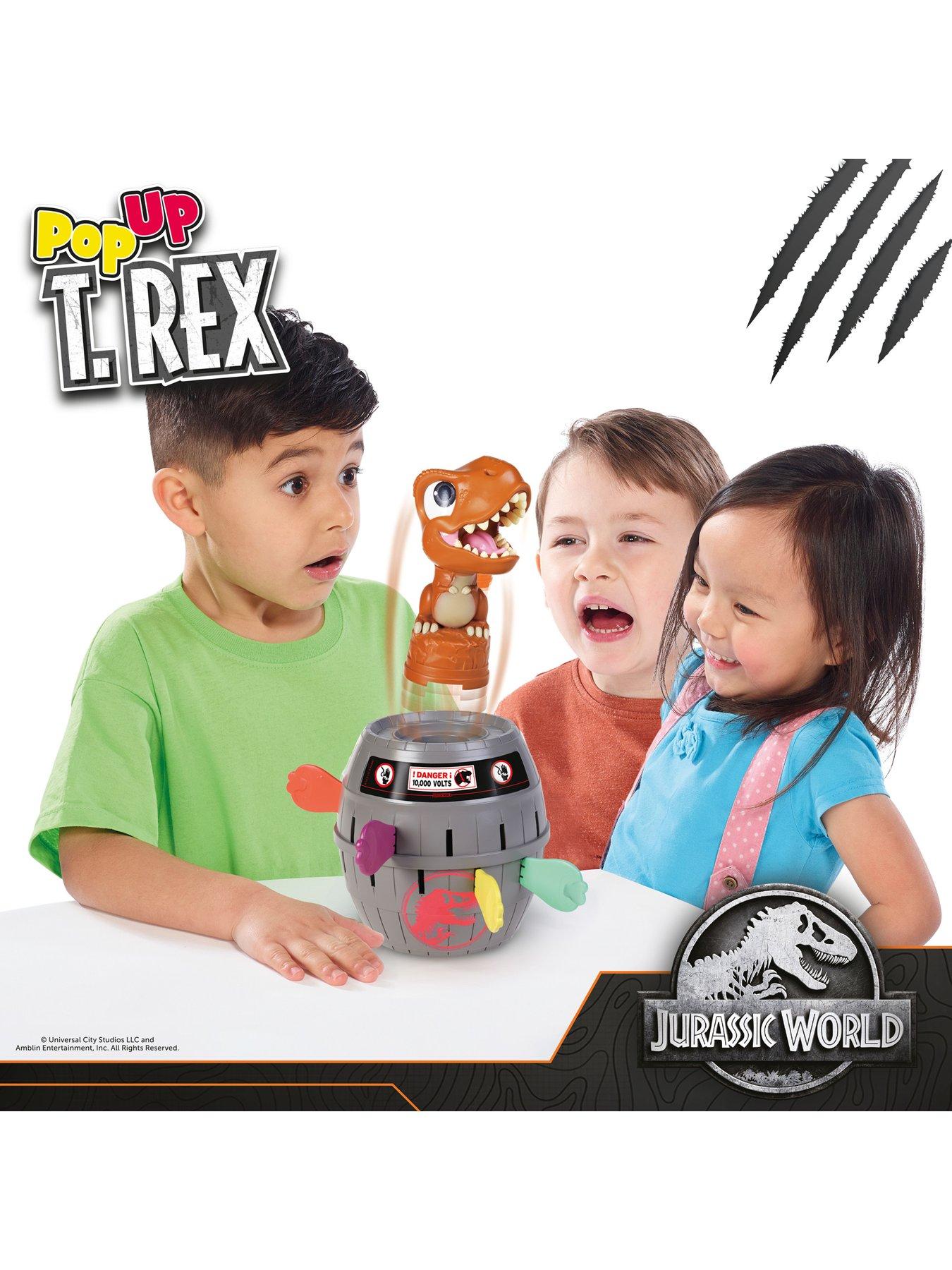This Pop-Up T-Rex takes you right to the heart of Jurassic World!Rumour has it that there’s a dinosaur trying to escape from his crate, just itching to get out! The only way to discover if he’s trapped or on the loose is to slide something through the sides of the cretaceous crate. Heart rates will rise, fingers will quiver… will you be the one to upset T-Rex?!To play, take turns to slide one of your coloured dinosaur bones into one of the slots right around the crate. If nothing happens, you’re safe - phew! However, if you make Rex pop, you’re out of the park and out of the game! Press and twist the dinosaur back into the crate and keep taking turns. Nobody knows which slot will make him pop next – it’s different every time! Keep playing in rounds and the last surviving explorer left behind wins the game! Dinosaur fans aged 4-104 will love this exciting game that is quick to set up and easy to learn - but always leaves you wondering what will happen next. One wrong move and you’re dinosaur dinner! Suitable for 2-4 players, it is the perfect way to travel back in time millions of years for family game night! Contains: