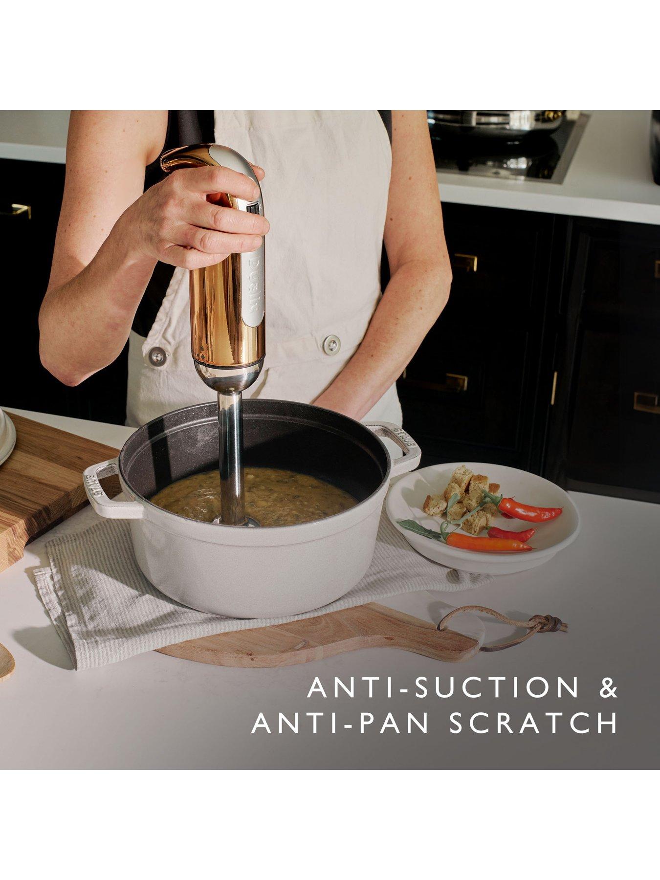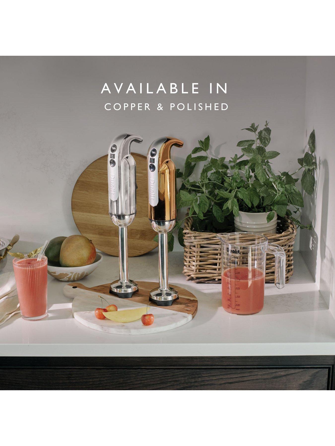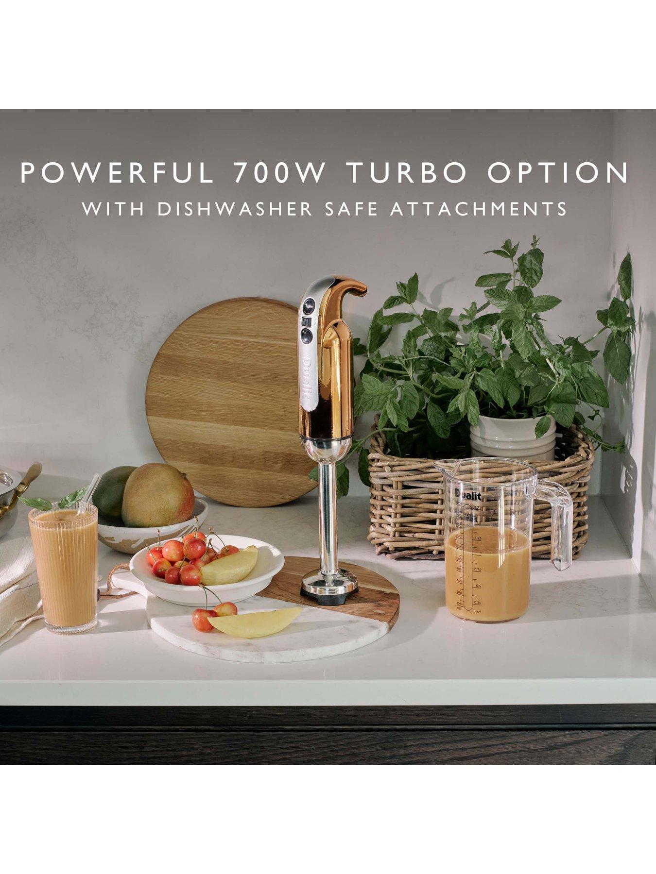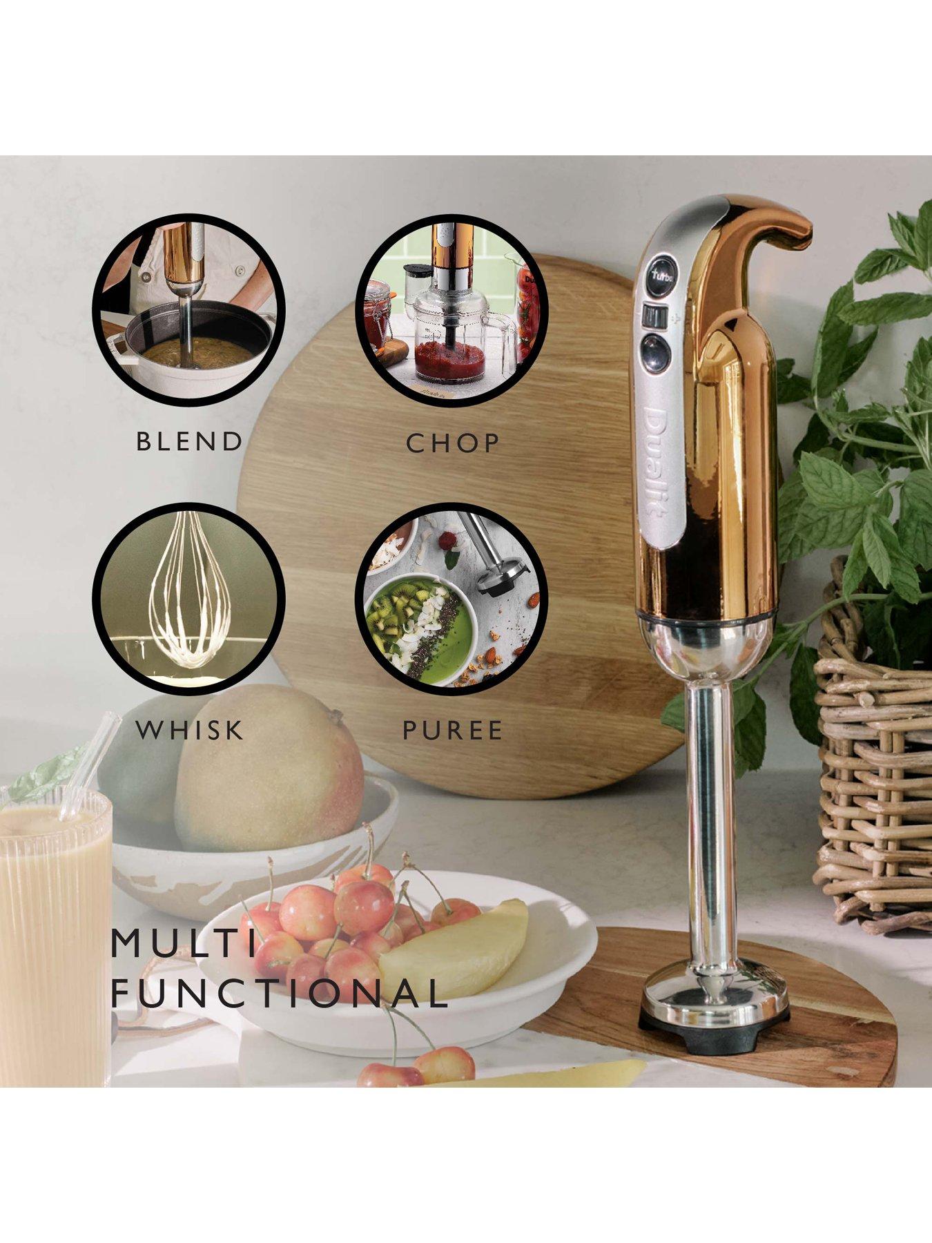 Dualit Copper Hand BlenderThe Dualit Hand Blender is a multifunctional kitchen essential, crafted for both versatility and power. With speed and precision, the 700-watt motor handles a variety of tasks from blending soups and smoothies to chopping vegetables and whisking cream. With an ergonomic grip that sits perfectly in your hand, you have complete control and thanks to the anti-suction blending wand it won't grip the bottom of your pan. It comes with an array of high-quality accessories, including a Blending Wand, Chopping Bowl, Whisk Attachment, and a Tritan Jug. With an extensive speed range (7,000-16,000rpm) and a super-charged turbo option (17,000-18000rpm), Dualit's Hand Blender is up to the toughest kitchen challenges.