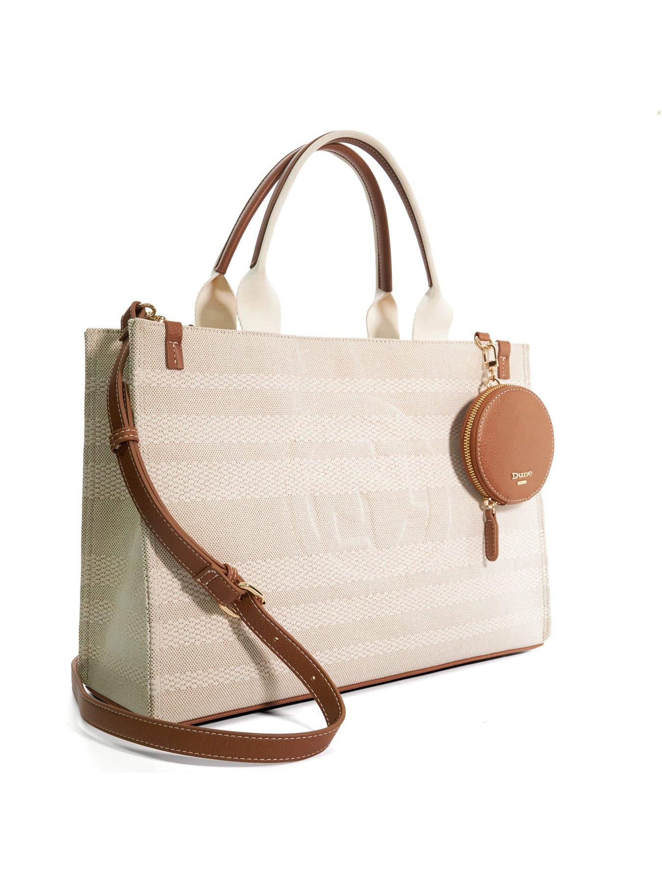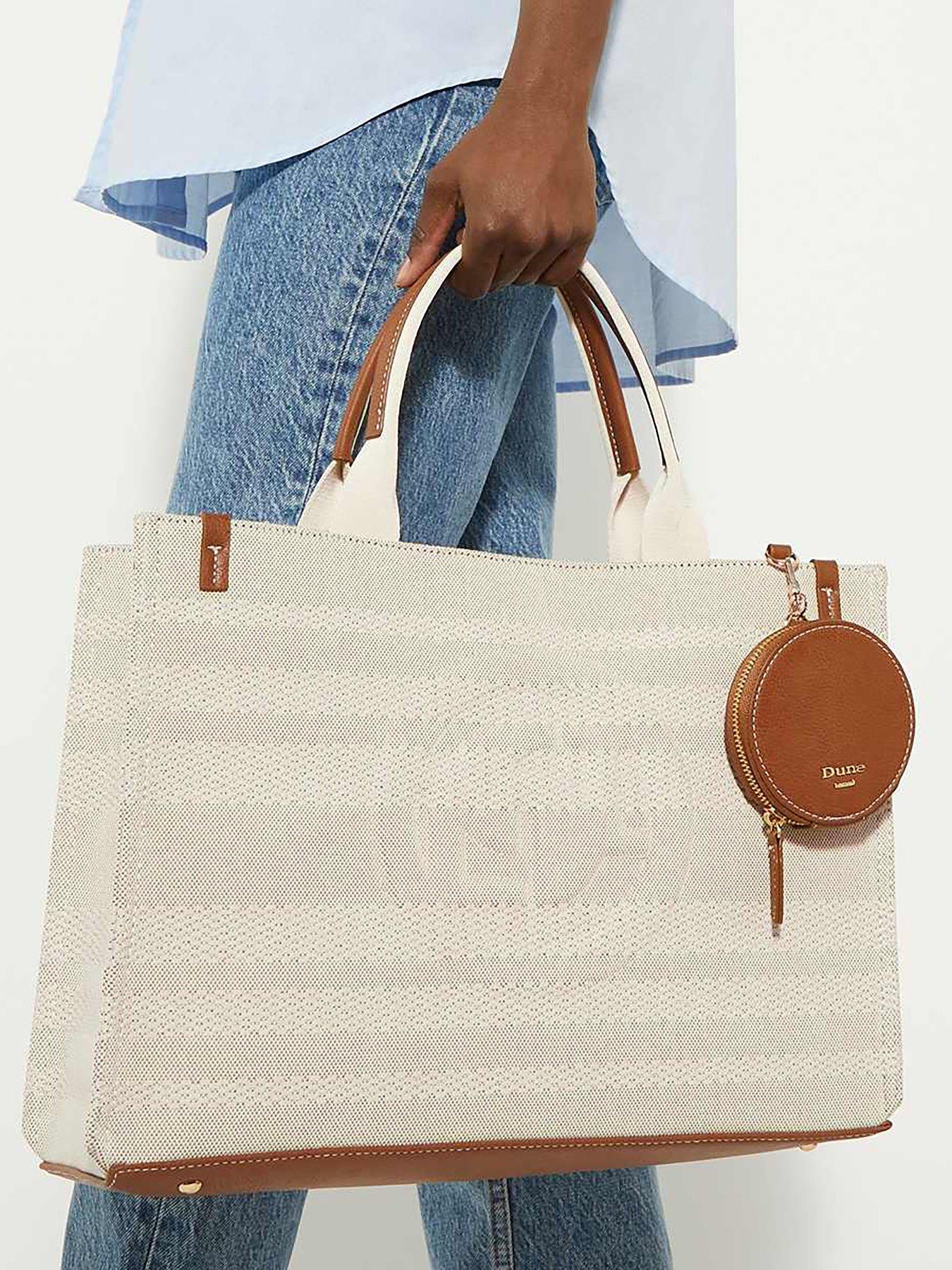 Dune London Deltra Day BagsA tote bag is an iconic staple style. Elevate your warm-weather ensembles with Deltra. Featuring a trimmed top handles and a removable strap for ease of wear this signature silhouette boasts a stripy motif and a detachable coin purse for organised storage and our bespoke embossing that's certain to take your holiday edit to the next level. Finished with a secure magnetic closure Deltra will become the focal point of your warm-weather ensembles.