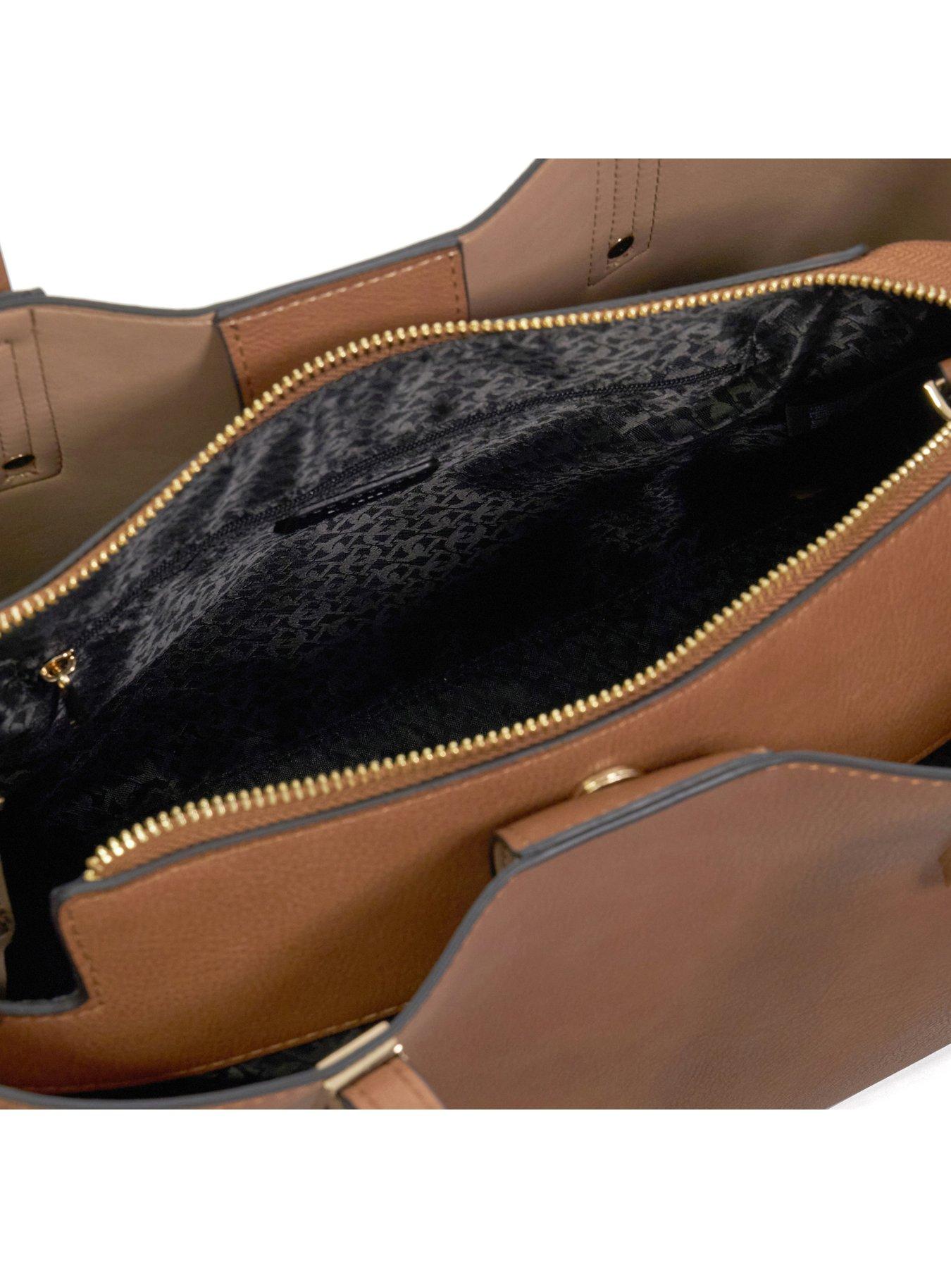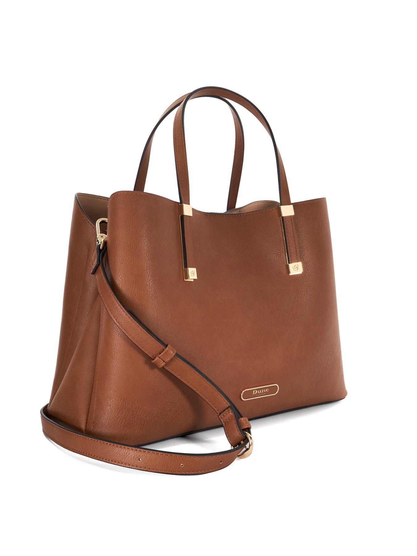 Dune London Dorry Branded Hardware Tote Bag - TanThoughtfully designed with convenient top handles and a crossbody strap Dorry offers multiple styling options. With handy zip and popper fastenings and gold-tone hardware this versatile tote is the perfect pick for days in the office and weekends away.