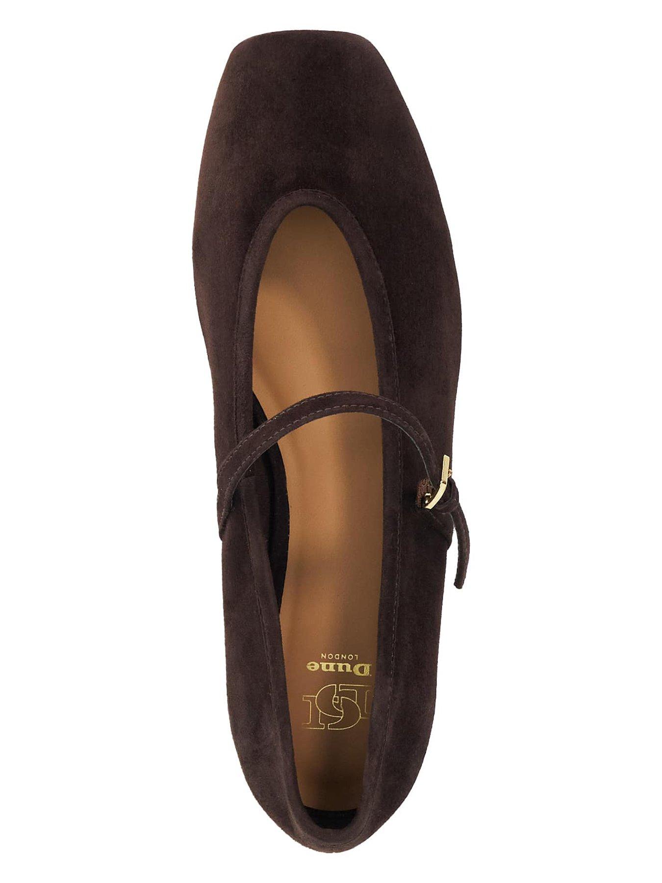 Dune London Hearthrob Ballet Pumps - BrownStep into timeless elegance with our Heartthrob Mary Jane. Crafted from soft suede this classic silhouette features a chic square toe a low suede heel and a delicate gold buckle for a touch of sophistication. Perfect for everyday wear or special occasions Heartthrob blends comfort with effortless style.