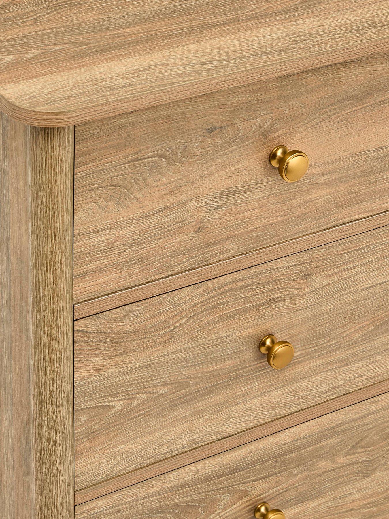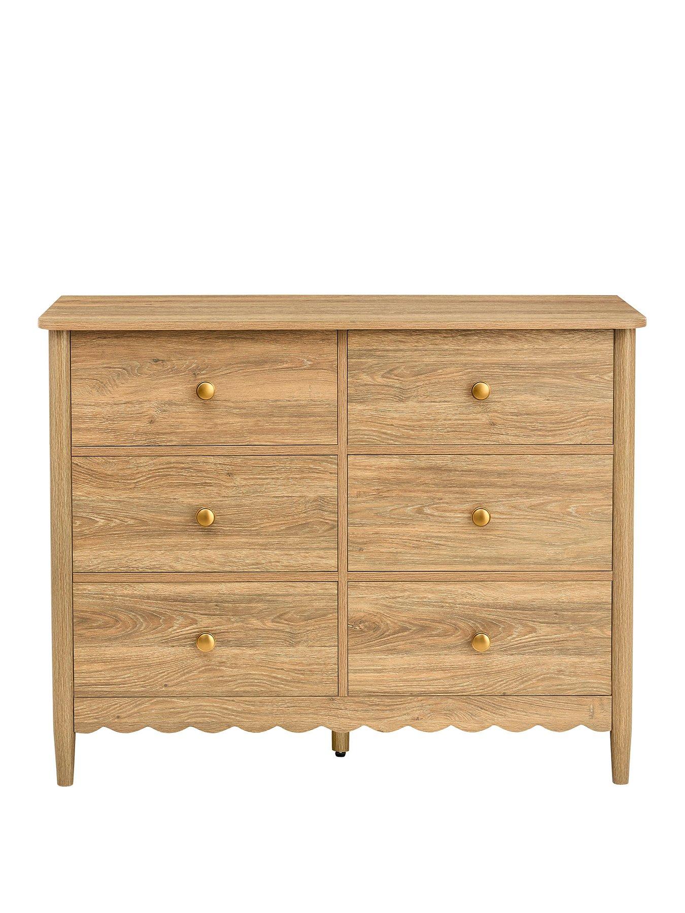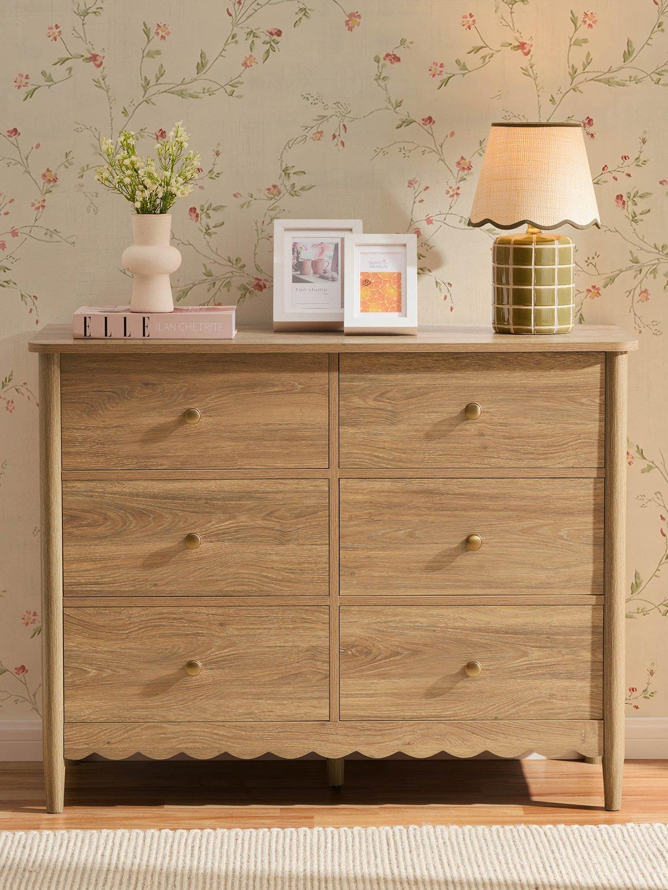 Dusk Betty 6 Drawer Chest - Light WoodThe Betty Large Chest is generous in space and rich in character.Spacious storage, cottagecore charm With six wide drawers and a beautifully scalloped base, the Betty Large Chest balances practicality with personality. Its design is soft yet structured, making it a standout piece in any bedroom while keeping jumpers, linens, and everyday essentials neatly stored. Two handle styles arrive in the box: one painted to match and the other in gold, giving you the freedom to mix and match or switch up the look whenever inspiration strikes. Spacious, versatile, and brimming with charm, the Betty Large Chest is the kind of piece you'll enjoy for years to come. Keep in mind: Our styled room images are for inspiration only, and colours may vary depending on lighting and surroundings. For the truest colour reference, please see the product images on a plain background.