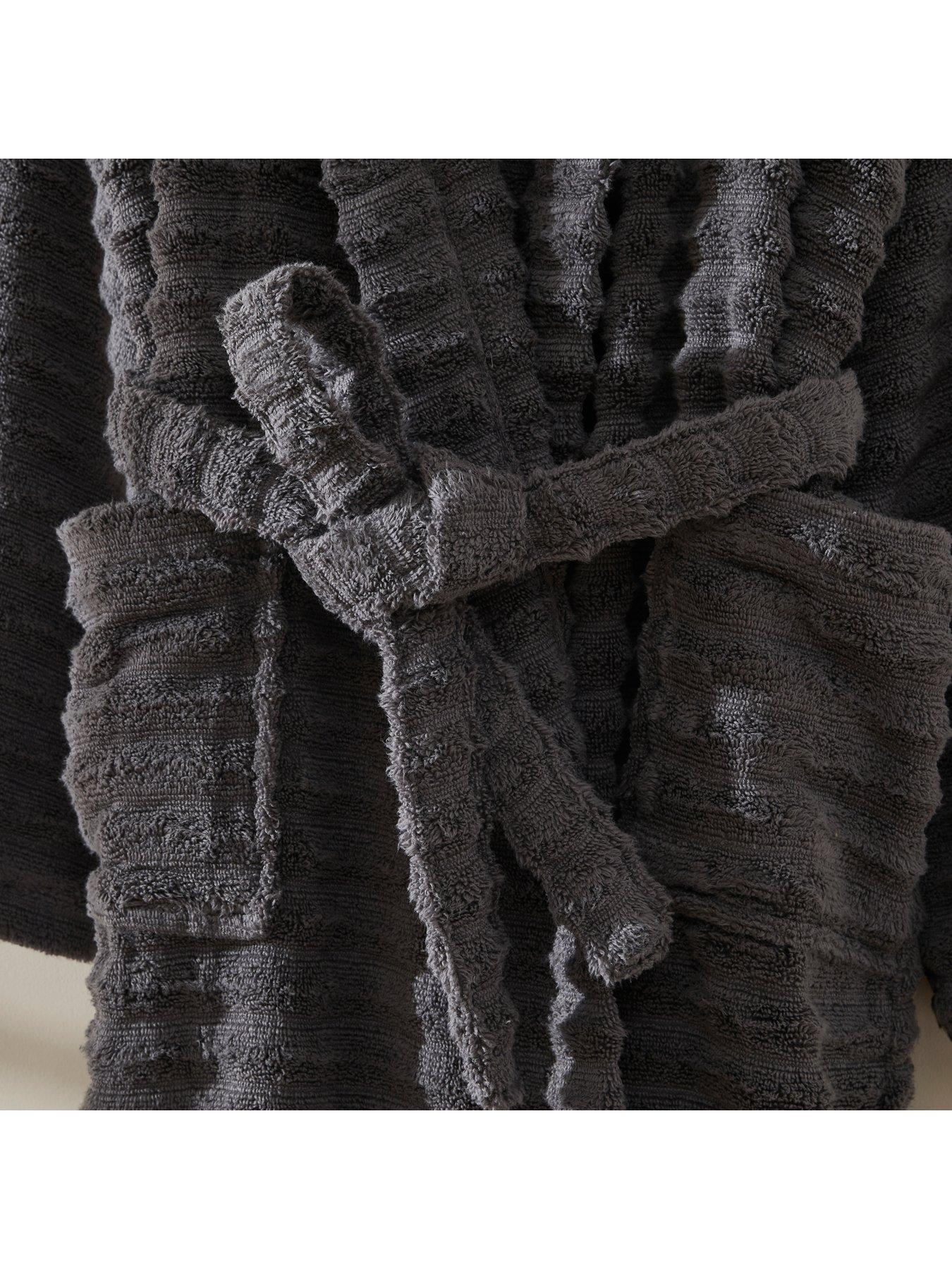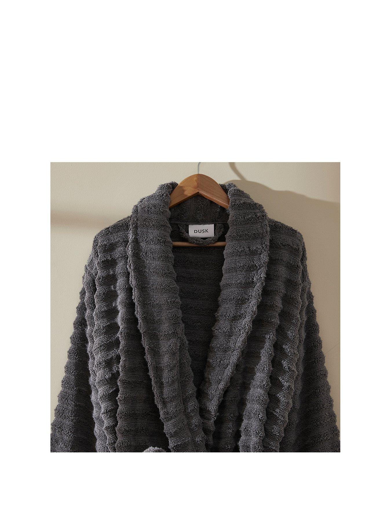 Dusk Charcoal Bathroom RobeBeautifully made with a luxuriously soft to the touch 100% cotton material in a stylish shade of charcoal, this towel dressing gown is set to become your everyday go-to. With a subtle rib design, this bathrobe is perfect both for her and for him. It's also absorbent, machine washable and can be tumble dried - the practical and perfect way to lounge and relax in comfort.