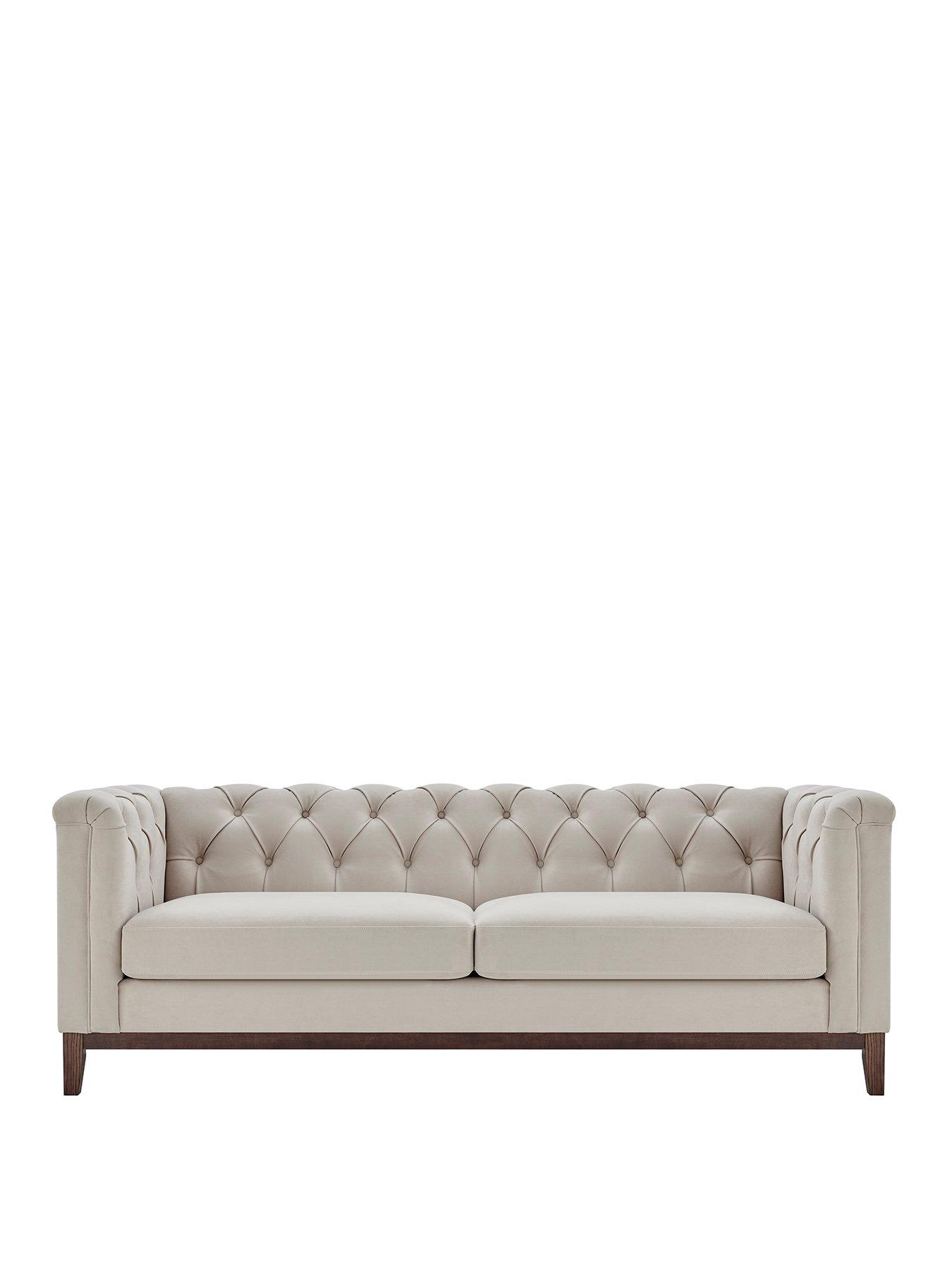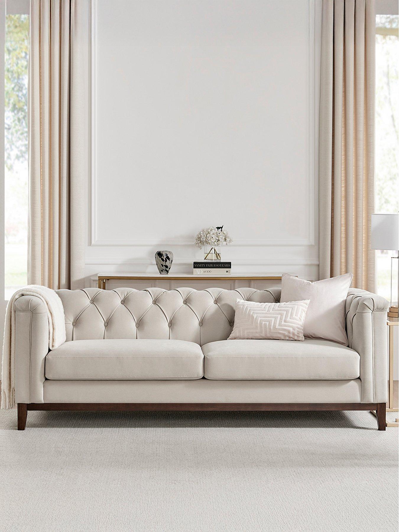 Dusk Chesterfield 3 Seater Sofa - StoneDiscover the matte velvet 3 seater sofa in stone from the Chesterfield collection as you get ready to relax and unwind.Premium style, made to last Whether you're stretching out to lounge in style, or enjoying long weekends with friends and family, the Chesterfield 3 seater sofa is the perfect place to enjoy every moment. Made with a premium matte velvet fabric in a neutral stone shade, this 3 seater sofa will blend seamlessly into any traditional or modern living space. Featuring a stunning quilted button design for a touch of flair and classic charm, it also has a beautiful dark wood frame for lasting durability and a stylish colour contrast. Mix and match throughout your home, or complete the look with the entire Chesterfield collection which includes: 2 seater sofa 3 seater sofa Armchair Pouffe Keep in mind: Our styled room images are for inspiration only, and colours may vary depending on lighting and surroundings. For the truest colour reference, please see the product images on a plain background.
