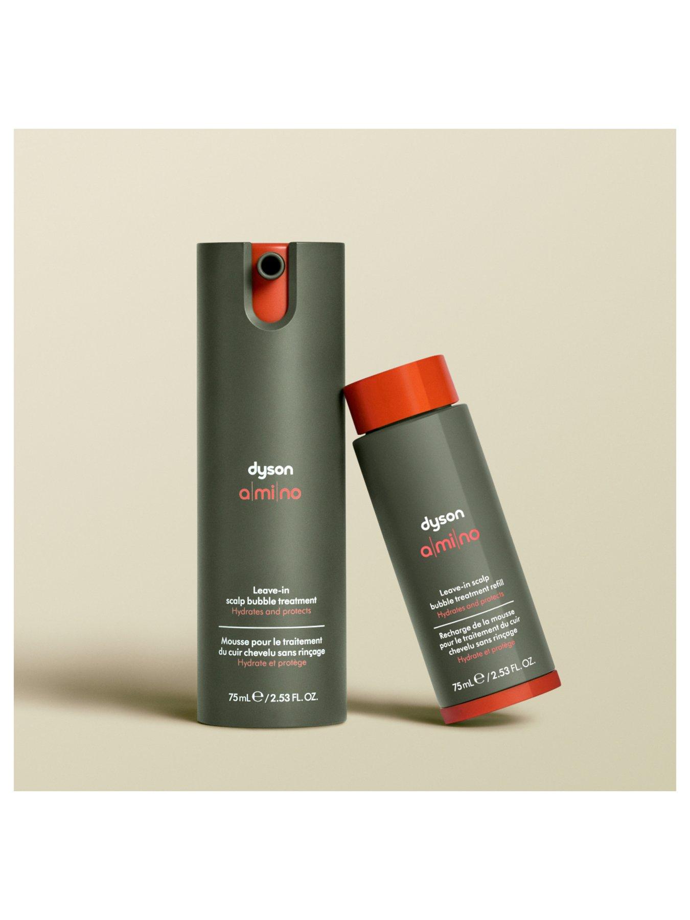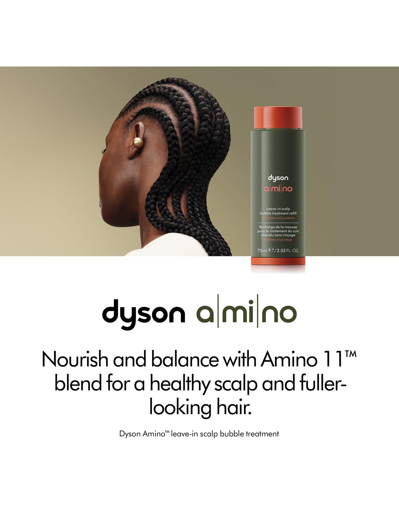 Hydrates, soothes and strengthens the scalpDeveloped to support fuller, healthier-looking hair. Dyson Amino™ leave-in scalp bubble treatment is an instant, foam-to-serum, leave-in treatment dermatologically tested for all scalp types. Best used daily.Powered by Dyson Amino11™ blend The barley grown on Dyson farms is rich in amino acids and minerals. Partnered with niacinamide and Ectoin® Natural, it restores the critical balance of moisture in the scalp. Clinically proven to reduce hair loss by 63%¹ and oil by 62%³. 88% saw a reduction in visible flakes.â´ Results: 88%: Immediately saw a reduction in visible flakes.â´ 85%: By the first month said scalp moisture and oil are balanced.² 90%: By the third month said their scalp is transformed and hair feels strong.² Reduces hair loss by 63%¹ Your scalp is the foundation of hair health, but it can be impacted by internal and external stressors. Dyson Amino™ scalp care is clinically proven to hydrate, protect and soothe while strengthening the scalp’s natural barrier. Day 0 vs. Day 84 Skincare for the scalp Made with clinically researched and tested ingredients –â¯the formula soothes, nourishes and rebalances the scalp. Tested by dermatologists. Proof in performance Clinically proven to reduce hair loss by 63%¹ and oil by 62%³. 88% saw a reduction in visible flakes.â´ Bright. Soft. Fresh Top notes of green tea and citrus with undertones of delicate florals and an earthy warm base note.