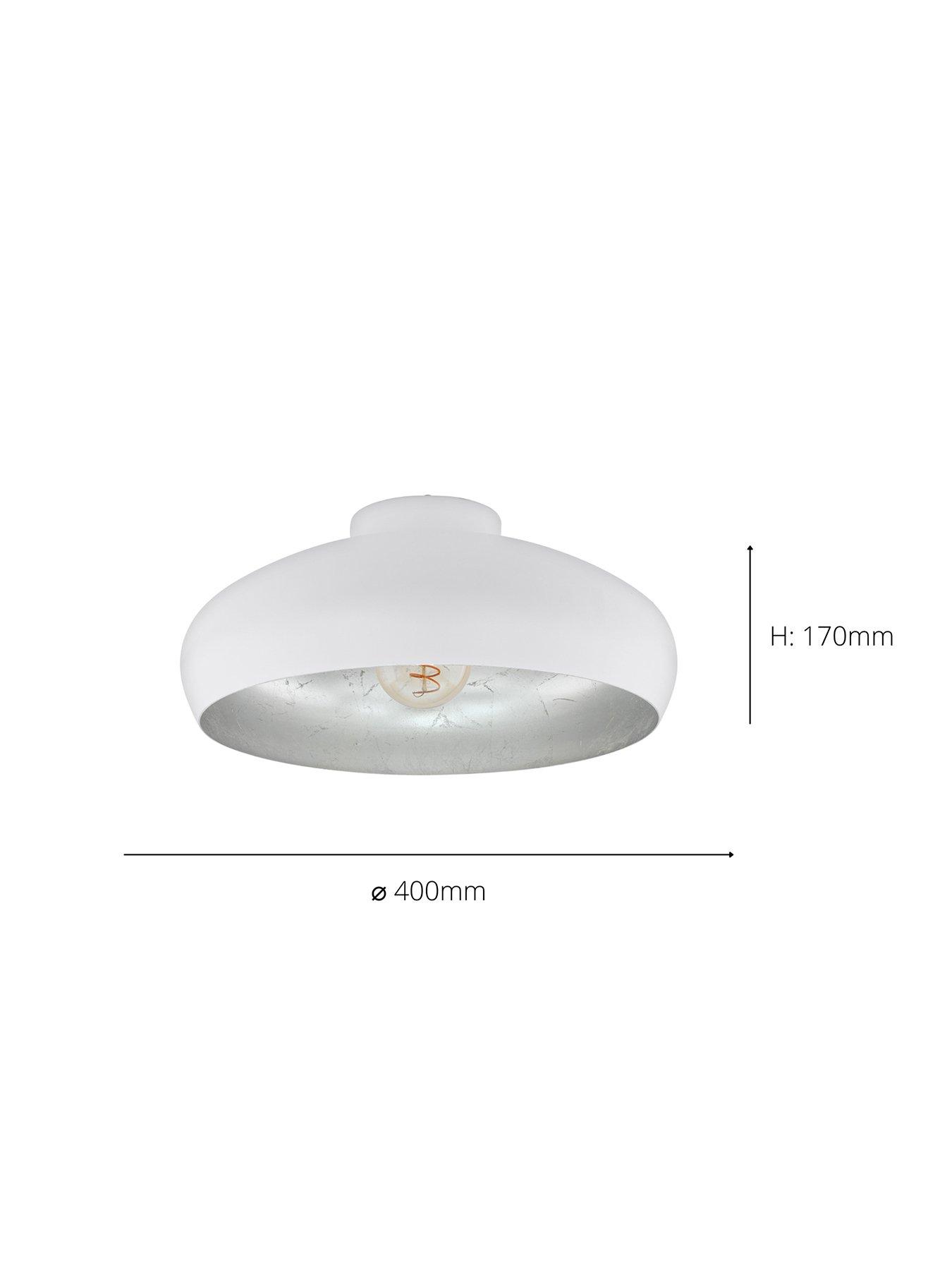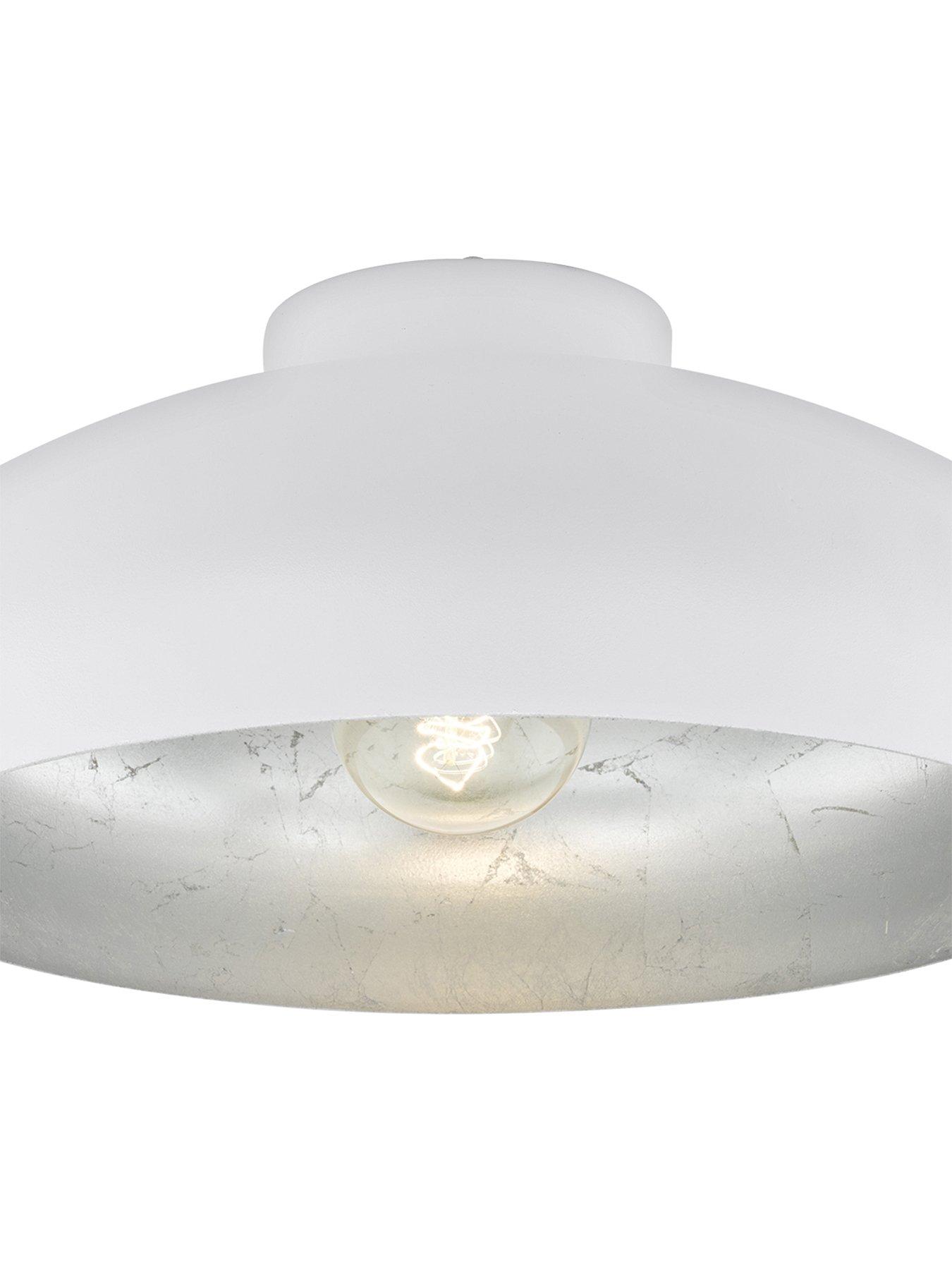 Eglo Mogano Vintage White And Silver Ceiling LightThe Mogano is a sleek flush ceiling light with a retro-inspired rounded shade.The fixture has a contrasting white and silver steel finish and is a great way to add metallic accents to your home. The ceiling light blends seamlessly into modern interiors, and with its flush design, the Mogano is a great way to illuminate homes or offices with lower ceilings due to its compact style. The Mogano requires 1x E27 lightbulb, which is not included.