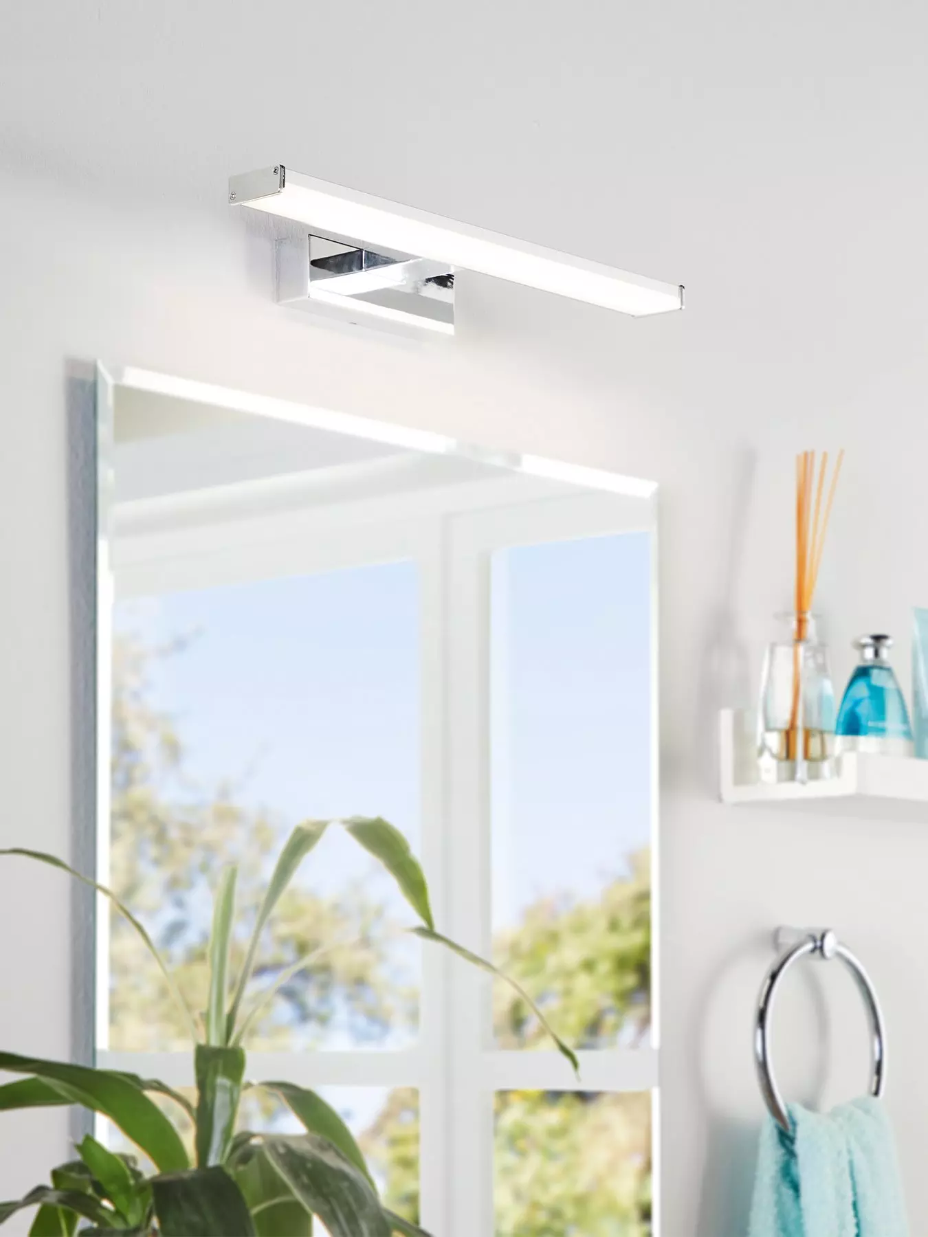 The Pandella 1 is a sleek mirror light with an IP44 rating and is perfect as bathroom mirror lighting.The fitting has a rectangular base and a slim bar design in chrome and silver plastic. The product has a white plastic diffuser with integrated non-replaceable LED components that produce a neutral white light when illuminated.