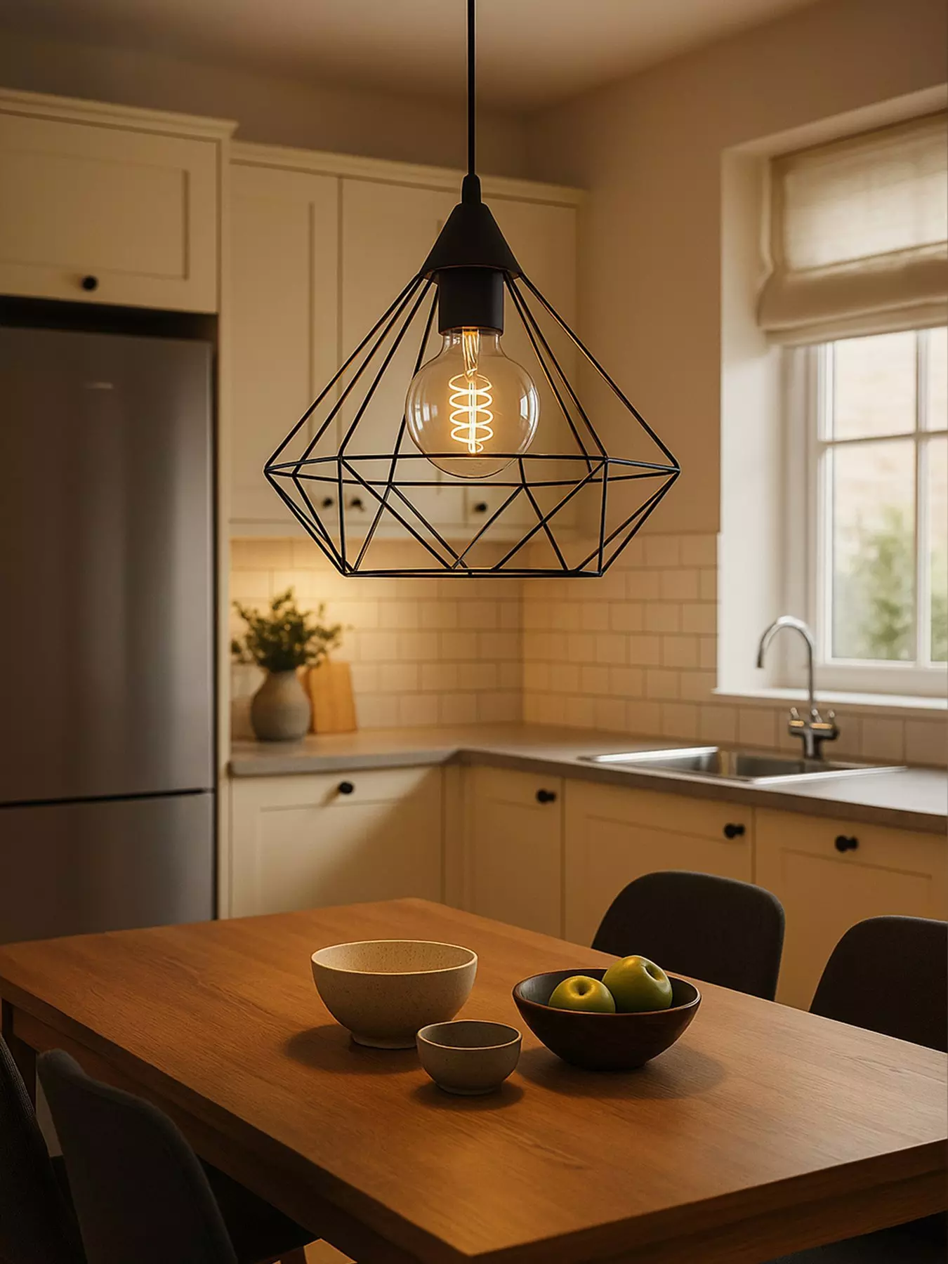 The Tarbes combines geometry with industrial chic.A single pendant light with a classic black finish, the Tarbes has a geometric wire shade with an exposed lightbulb style. The product requires 1 x E27 lightbulb, which is not included and would look great when paired with a larger retro-style lightbulb for maximum impact.