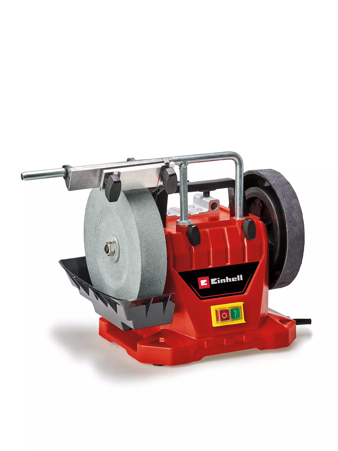 The Einhell wet sander TC-WG 200 is ideal for sharpening your tool without damaging the workpiece to be machined. During sanding, water is slowly supplied to the cutting edge, preventing frictional heat and annealing of the disc. The universal device provides flexibility for sanding a wide variety of tools, while the corrosion-free water tank cools the workpiece. The angle gauge for adjusting the sanding angle is included in delivery. The sanding wheel can be prepared with the grindstone. Four rubber feet damp vibrations and ensure firm and secure standing. Delivery includes a slow-running, fine-grained wet sanding wheel and a leather sanding wheel for removing burrs.- Accessory List: Wet grinder, wet grinding disc, polishing disc, grinding stone, guide arm, clamping device, angle ga