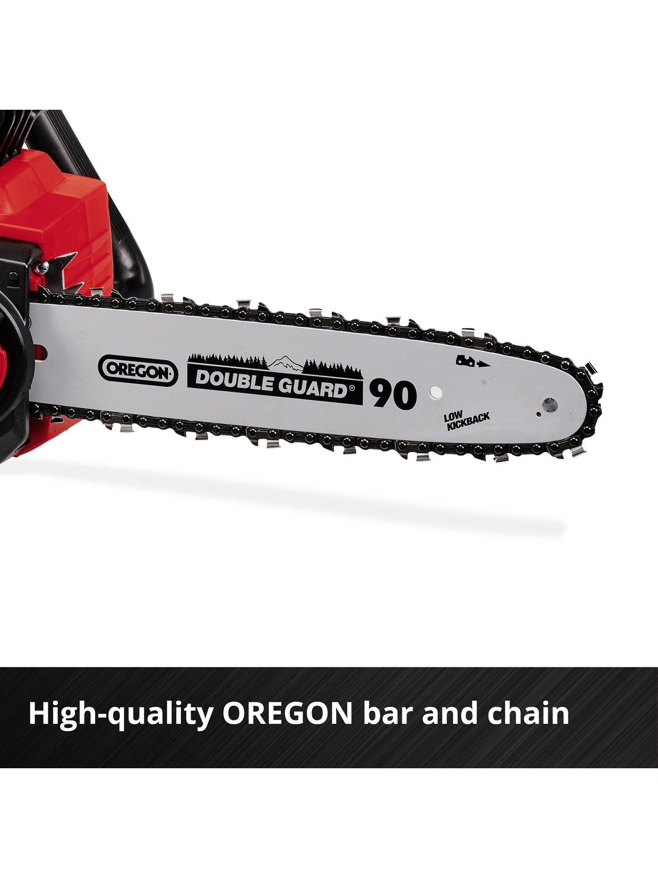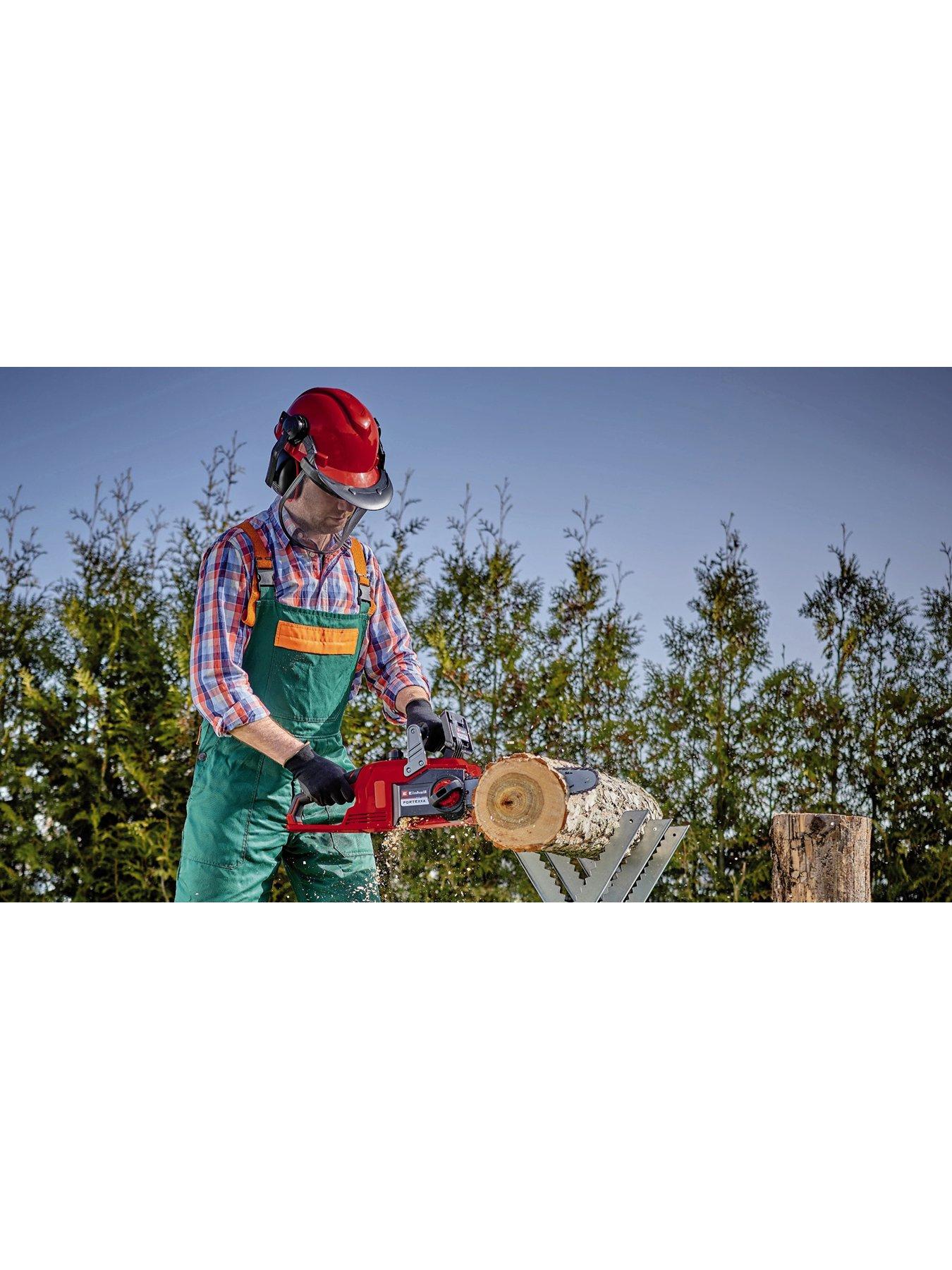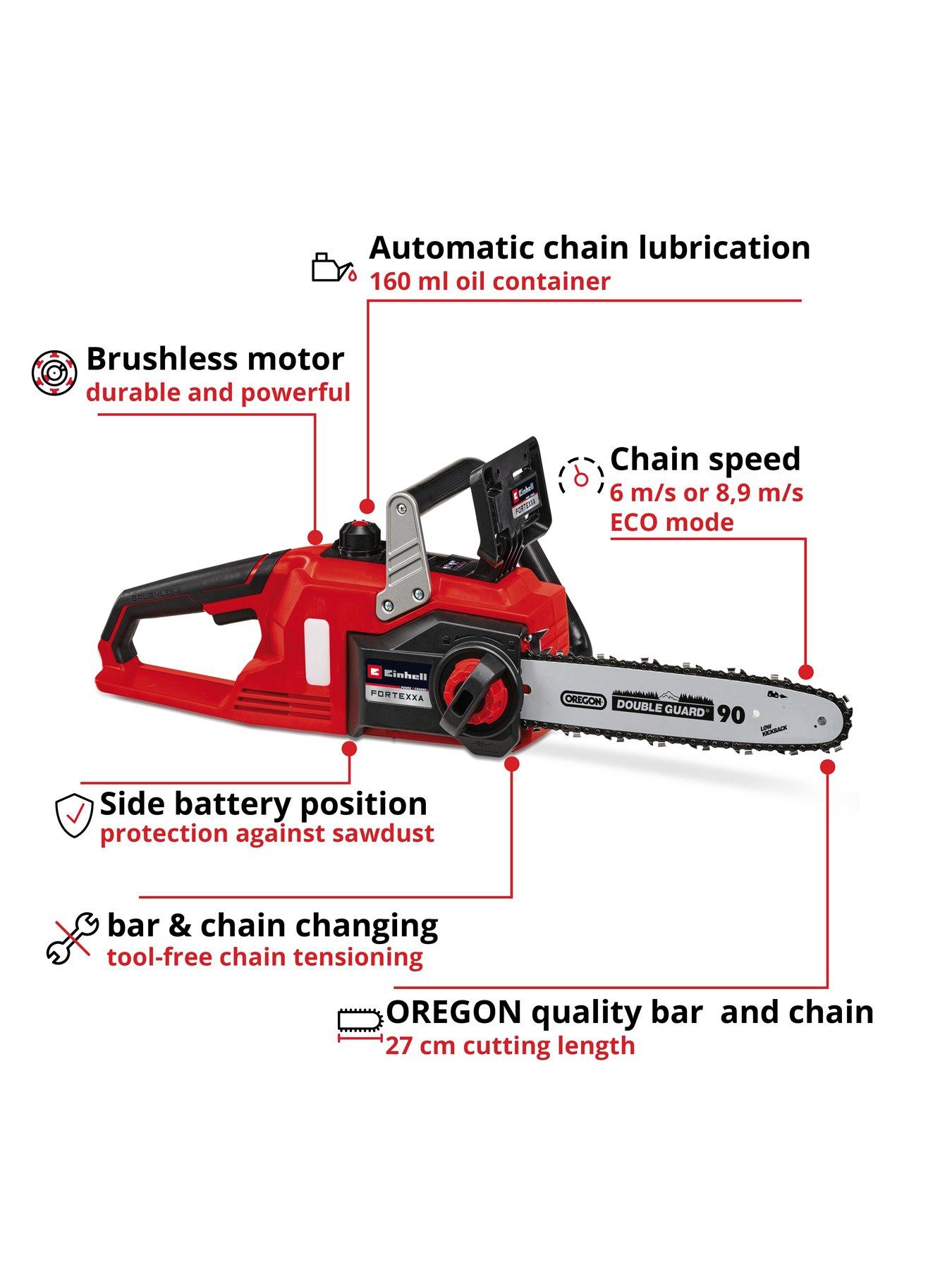 The Einhell PXC Cordless FORTEXXA Chainsaw offers power, freedom and convenience.BRUSHLESS MOTORAs the perfect helper for woodwork on thickly branched fruit trees and dense foliage and conifers, the FORTEXXA is powered by the Einhell PurePOWER brushless motor. This brushless motor offers more power and a longer running time than conventional carbon brush motors. After registering online, the brushless motor comes with a 10-year warranty. OREGEON BLADE Together with the OREGON quality blade and chain, even thick twigs and branches hardly have anything to do with FORTEXXA. POWER X-CHANGE The Einhell cordless chainsaw FORTEXXA 18/30 is a powerful member of the flexible Power X-Change family. The innovative Power X-Change series batteries are interchangeable among the devices of the Einhell system series. Any system battery can be used with any Power X-Change device. A Power X-Change 18 volt battery is required for operation - available separately via code RR6WR. CORDLESS CONVENIENCE The cordless version of a chainsaw also delivers the best results when working with work and squared timber as well as firewood. With no cord to hold you back, you will be an unstoppable sawing titan. No hesitation or searching for extension cords - simply switch on and work anywhere. TOOL-FREE ADJUSTMENT A chain tension that can be adjusted without tools and an equally simple chain change make handling easier. The chain catcher and the kickback protection with instant chain brake ensure safety during use and the automatic chain lubrication via the large oil filling opening for easy care. EASY GRIP FOR IMPROVED CONTROL The robust claw stop is made of metal, the ergonomic handle is equipped with softgrip for a firm and secure grip.