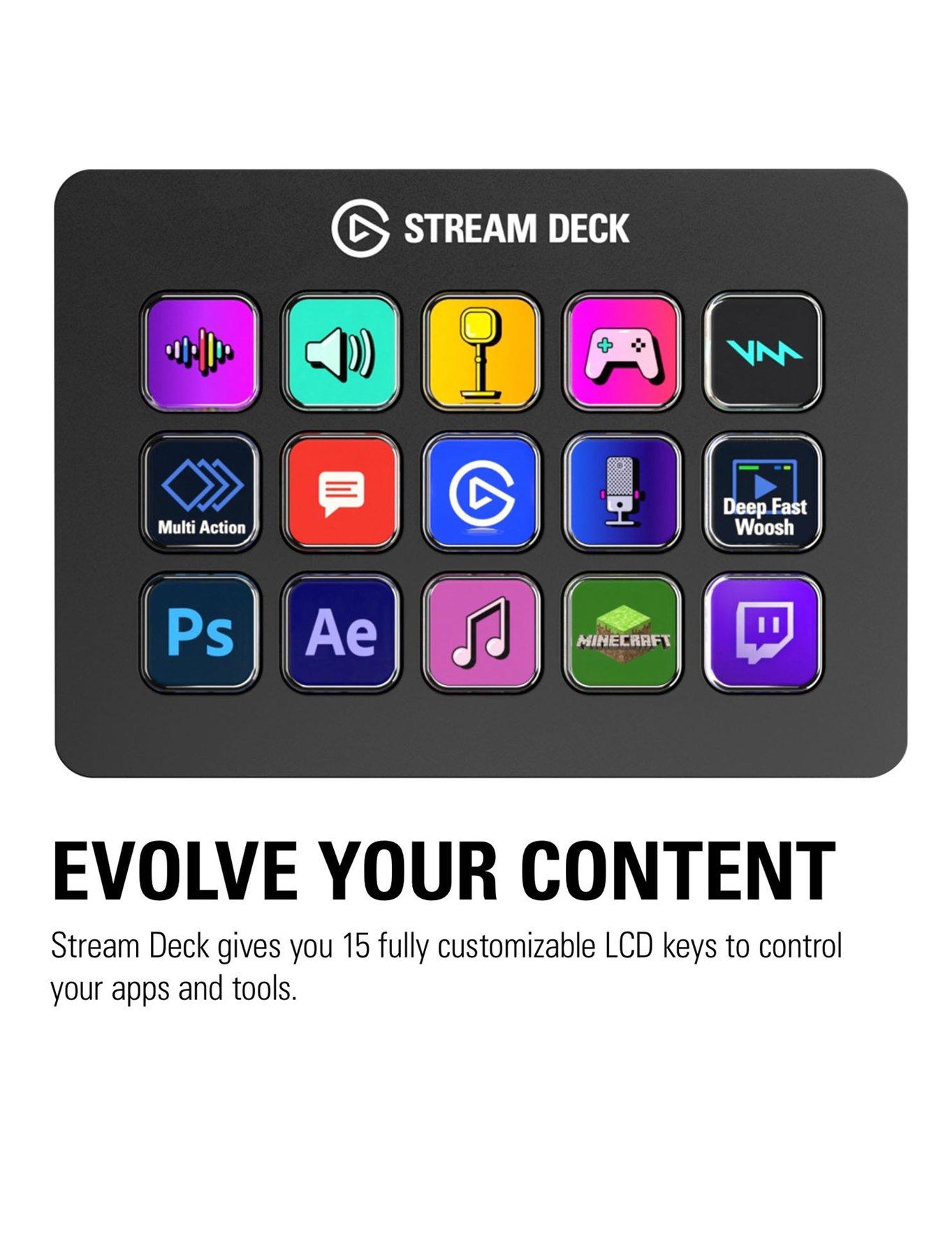 Elgato Stream Deck Mk.2 Controller - helping creatives give their content the professional touch.INSPIRE YOUR CONTENTIdeal for content creators and streamers, the Stream Deck features 15 customisable LCD keys to control apps and platforms in sync with your streaming software. You can use the the Elgato Marketplace to access app plugins, icons, tracks plus effects, and keep your set-up fresh with interchangeable faceplates. EVERYTHING AT YOUR FINGERTIPS From broadcasting and editing to designing, developing and networking - Stream Deck offers one interface to control your apps and tools. The 15 LCD keys can be used to control apps, launch social posts, adjust audio, mute your mic, turn on lights and so much more, while visual feedback confirms your commands. Trigger sound effects and audio clips. Launch GIFs and onscreen videos. Activate your lower thirds, intermission screen, and signature outro graphics. With Multi Actions, any number of actions can be stringed together, assigned to one key, and triggered intermittently or all at once. HOTKEY ACTIONS Hotkey Actions let you cram macros into keys for instant identification and deployment without error. Launch apps and websites, open folders and access pre-composed texts. Streamline your film editing, music production or photography workflow. Plugin options include Elgato 4K Capture Utility, Wave Link, Control Center. OBS, Twitch, Twitter, XSplit, YouTube and Spotify. iCue, Philips Hue, LIFX, IFTTT. Zoom, PowerPoint, Keynote, Apple Mail, and loads more. REMOVABLE FACEPLATE Stream Deck MK.2 features a removable faceplate that you can switch out and modify with ease. Choose from a growing range of epic designs, or slap on some paint and decals to create your own. Completely personalise your Stream Deck MK.2 with custom icons and screensavers.