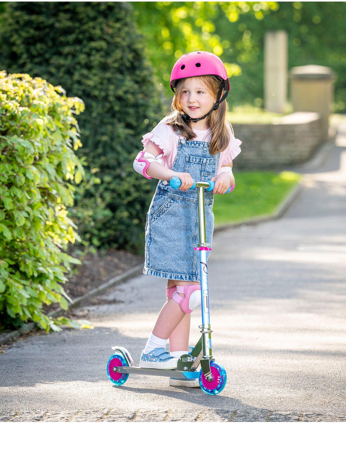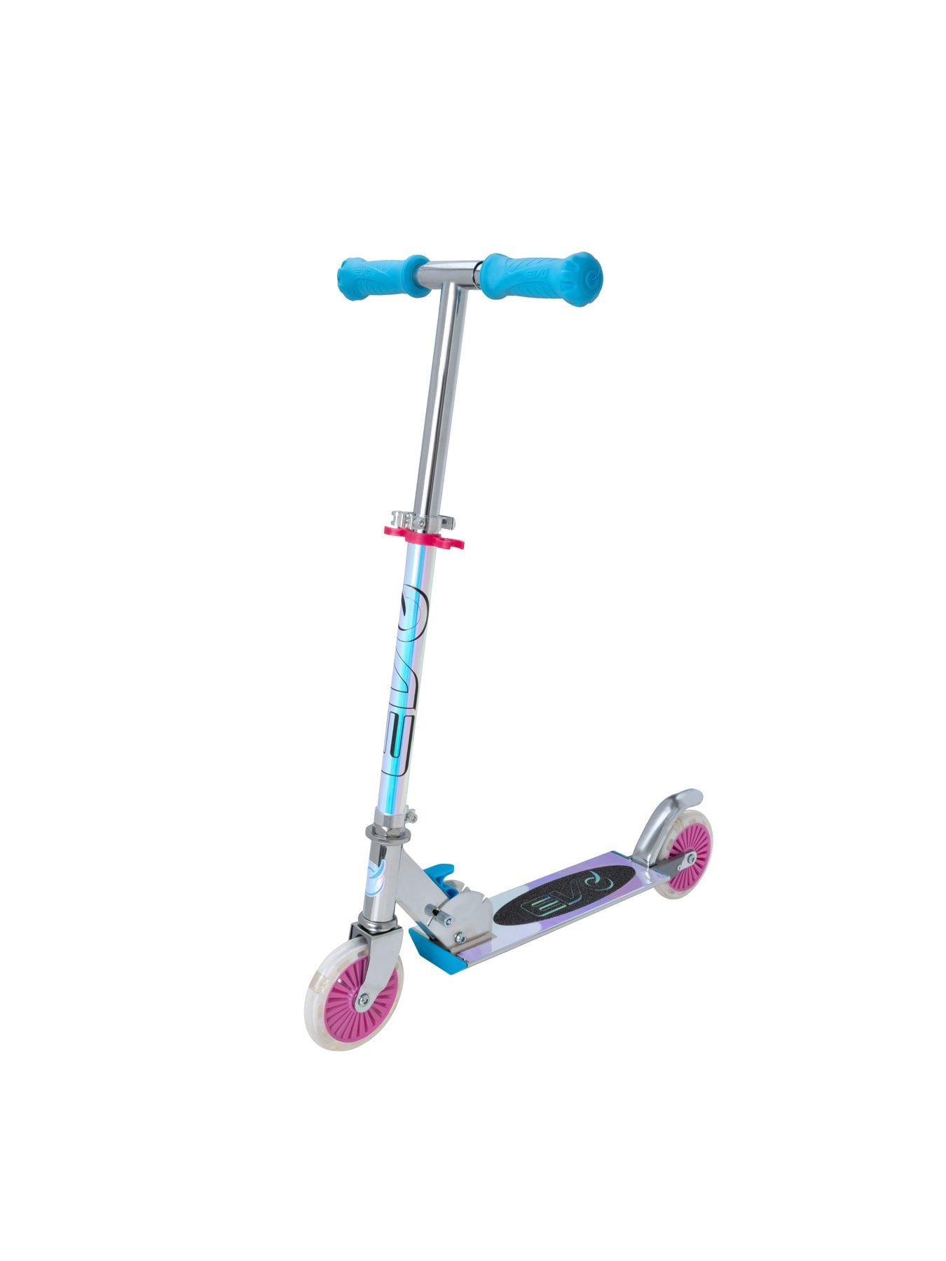 EVO Holographic InlineWatch your child's face light up with joy as they have hours of fun with this Rainbow Blast Scooter! This 3-wheel scooter is designed to help children to develop balance and coordination, with a simple steering system, just lean and steer! In addition, the two 120mm wheels at the front and 100mm wheel at the back of the scooter with rear foot brake provide a sturdy and safe experience. Your little one will love scooting around on this Rainbow Blast scooter with the light up deck! This kids scooter boosts many features including anti slip footplate, TPR handle grips, ABEC 5 bearings, alloy frame and an adjustable handle height of 69- 79cm which is great as the scooter can grow with your child. Maximum user weight 50kgs and is suitable for 3 years and over.
