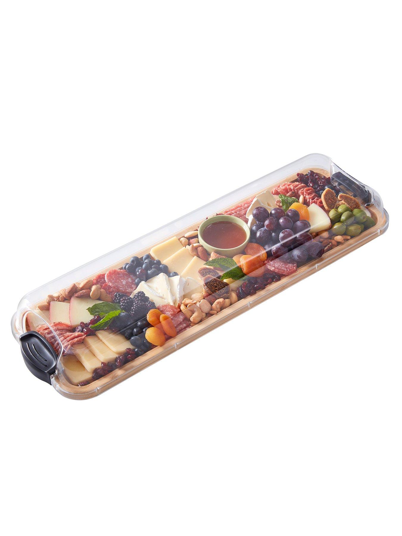 Faberware Long Build-a-Board Bamboo Serving Board with Locking Lid, 17.5 x 56cmSay goodbye to boring serving and storage - this bamboo platter is as stylish as it is practical! It is made from bamboo and adds a sleek style to your kitchen and storage. The clear lid makes it easy to see whats inside while keeping everything fresh and tasty. It is perfect for hosting guests and for everyday use as well. Use it to serve snacks and a stunning charcuterie spread or as a decorative piece on the countertop; it will only add style. The easy snap-lock handles ensure a secure, mess-free experience, even on the go. Plus, with BPA-free materials, you can snack with peace of mind, knowing its as safe as stylish. Dishwasher and fridge-safe, this platter is the ultimate combination of convenience and beauty for every occasion.