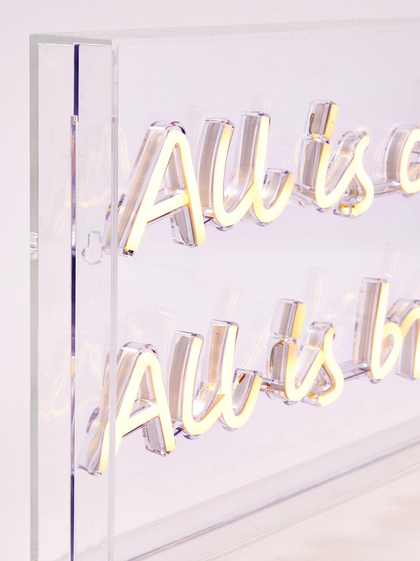 Festive All Is Calm and Bright Light Christmas Decoration - 30 x 47 cmWhat better ways to enjoy those silent nights during December than by sitting with your loved ones and admiring this All Is Calm, All Is Bright light up sign by Festive.Measuring 30 x 47 cm, the words of the iconic hymn are created from neon flex LED lighting which has been fashioned into a handwritten style. Encased in clear plastic for a modern look, it will sit perfectly on a side table, sideboard of in the centre of your mantlepiece. Powered by a USB plug, it has a 1.8m cable.