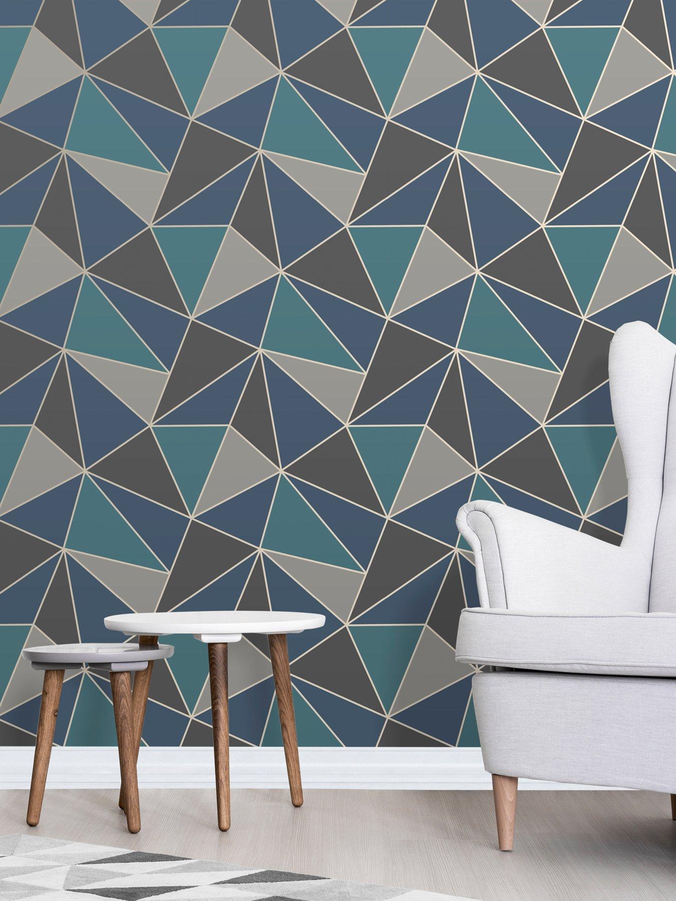 Fine Décor Apex Geo Aqua and Navy WallpaperApex Geo puts a subtle spin on the contemporary appeal of geometric motifs.Designed by Fine Décor, it sees a series of triangles carefully arranged and brought to life by an indulgent palette of aqua and navy blue tones, along with shades of light and dark grey. This stunning layout builds an almost 3D appearance and add a refined finishing touch that’s perfect for glamorous spaces. Hang this paper as part of a feature wall and revel in the classy look it creates.