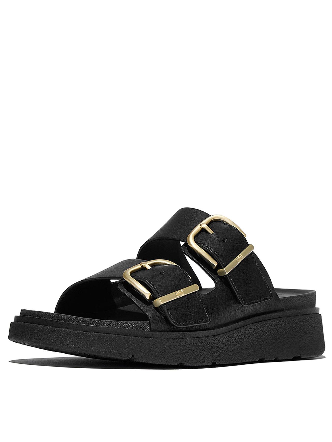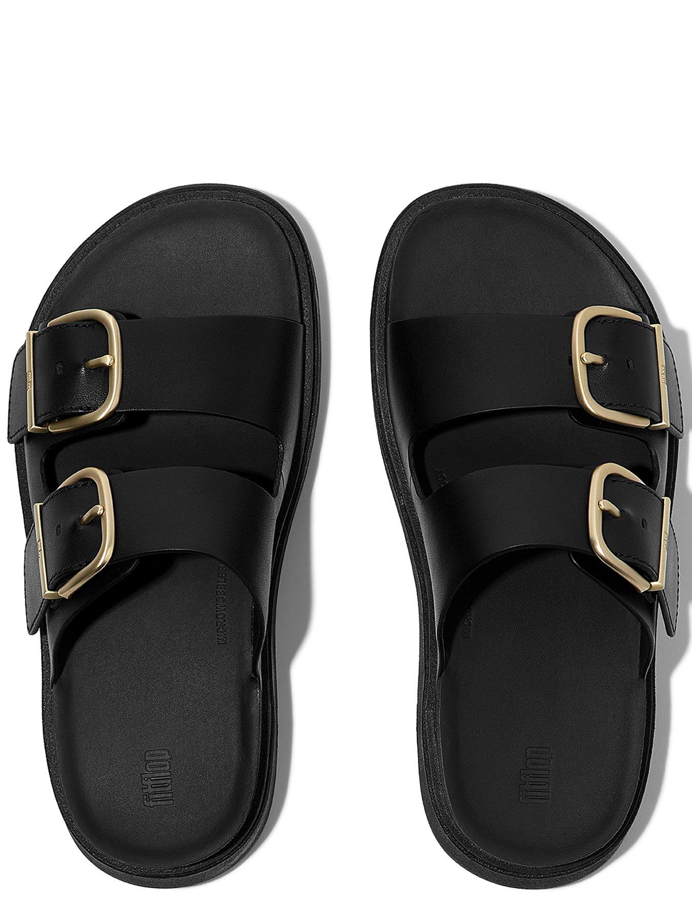 FitFlop Gen-ff Buckle Two-bar Leather Slides - BlackOur next-generation sandals bring a luxe modern edge to the classic Two-Bar Sandal.Boasting a directional chunky sole and simple soft-leather strap, with a domed stud at the front. A curvy brushed-metal buckle customises the fit. While minimal stitching and leather linings/welt sole detail add to the refinement. On our ultra-cushioned Microwobbleboard midsole. Beautifully crafted, ergonomically comfortable sandals youll want to wear every day, everywhere. Ergonomically engineered to help optimise your bodys alignment, natural movement & energy Light pressure-diffusing Microwobbleboard midsole - triple-density cushioning follows 3 footstep stages (firm heel/soft middle/medium at toes) Natural arch support Wide fit - if you have narrow feet, consider sizing down for a more comfortable fit Grip suited to country paths/light trails Metal hardware - 100% zinc These shoes have been granted the APMA* Seal of Acceptance, for footwear found to promote good foot health *American Podiatric Medical Association"
