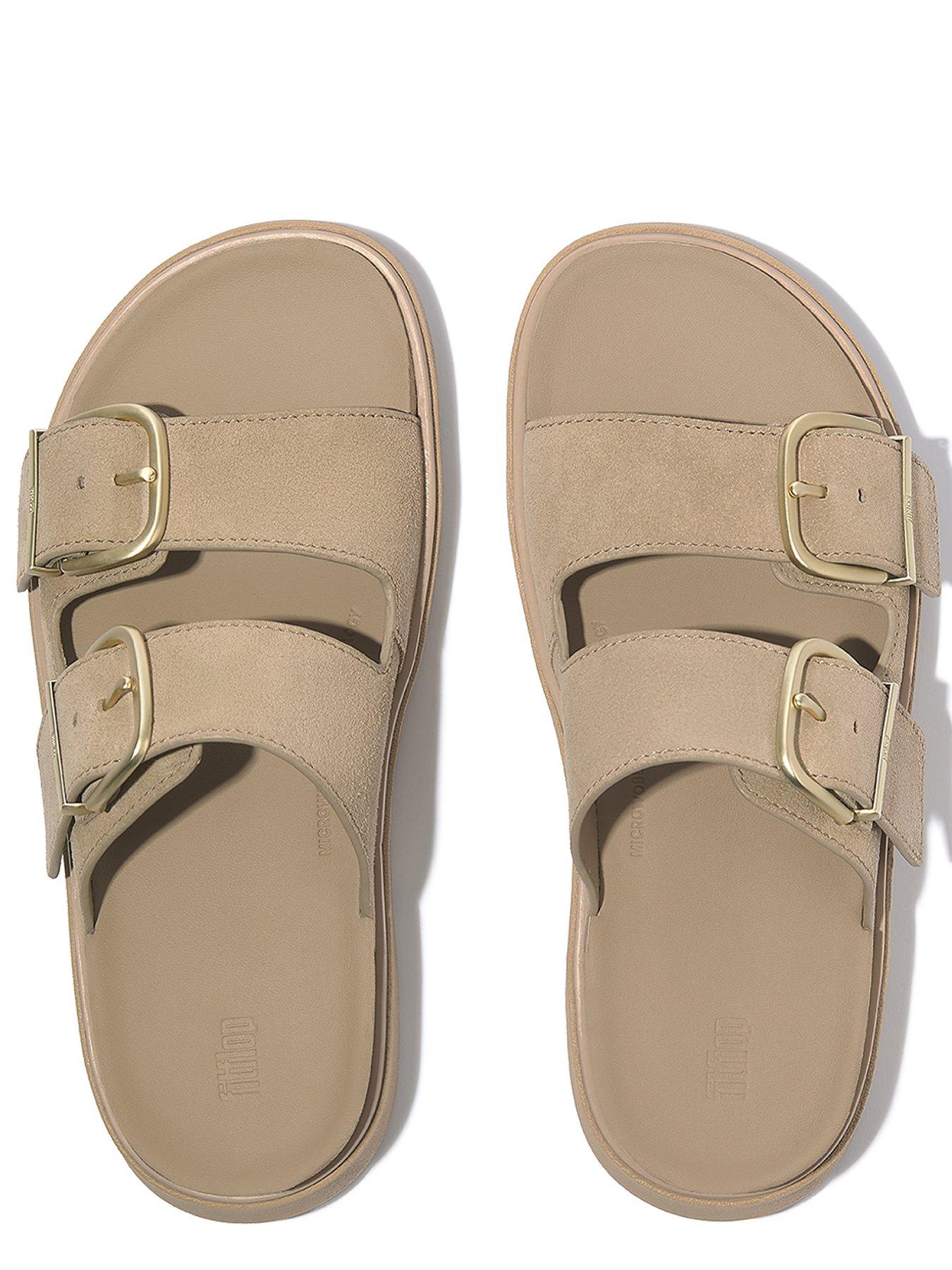 FitFlop Gen-ff Buckle Two-bar Leather Slides - CappuccinoOur next-generation sandals bring a refined, modern edge (and our original ultra-cushioning tech) to the classic adjustable two-strap leather slide.Boasting a directional, chunky sole and simple upper crafted from soft high-quality leather, this take on our two-strap Gen-FF sliders are secured by two square, brushed-metal buckles for a customised fit. Perched on a light, clean-look version of our triple-density Microwobbleboard midsole with a cork rim, this pair is biomechanically engineered for pressure diffusion, impact reduction, and long-lasting cushioning. On the base, rubber pods ensure excellent grip, suited to country paths and light trails.