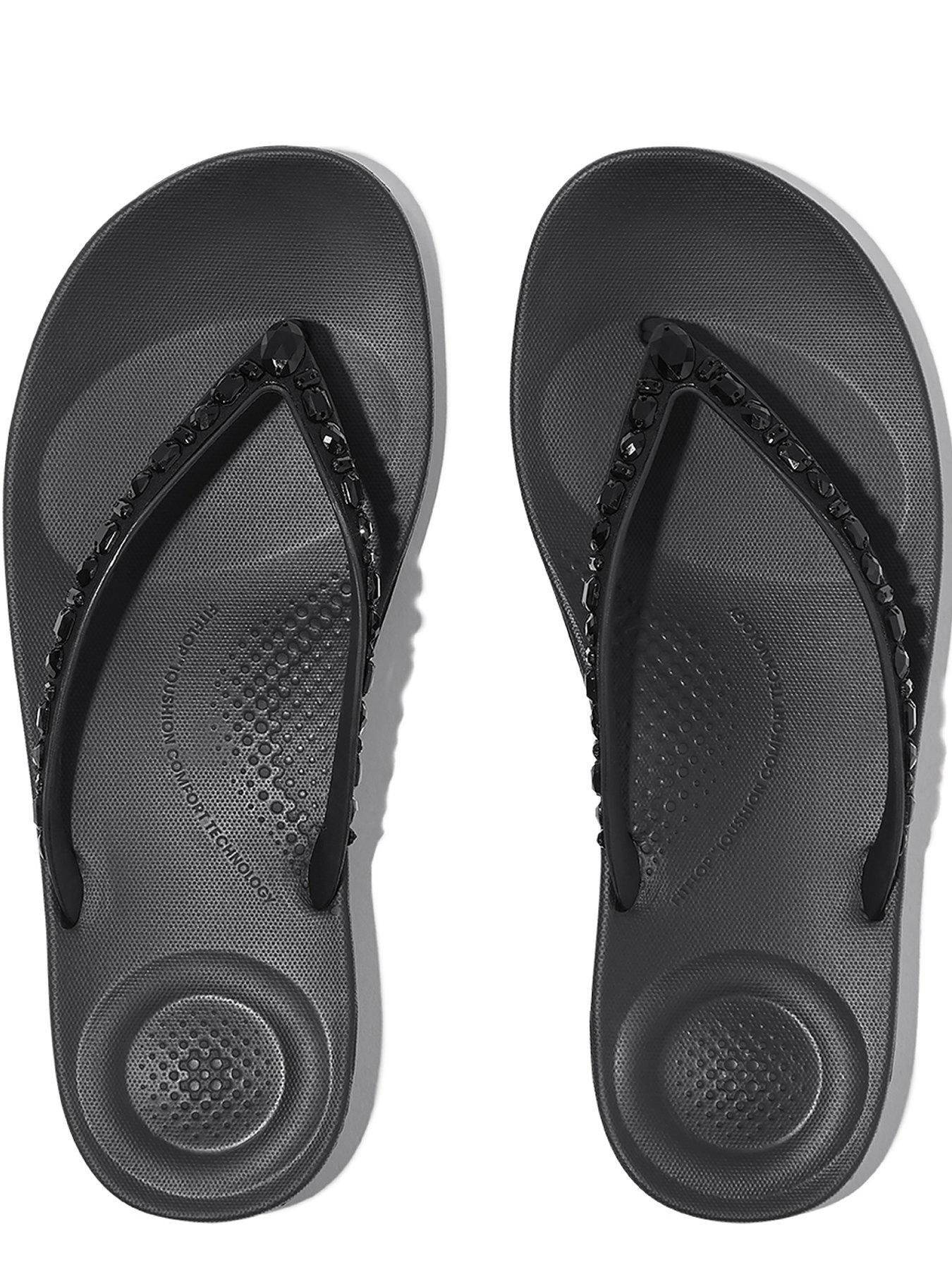 FitFlop Iqushion Multi-crystal Ergonomic Flip-flops - All BlackFrom the top, they look like classic beach flip-flops.Underneath, they feature our sleek light iQushion midsoles - biomechanist-developed to maximize comfort and support in a slim design. Even on the longest walks. With anatomically shaped straps that hold the sandals to you, helping stop toes 'gripping'. Here studded with sparkling multi-shaped chunky 'crystals' (faceted to catch the light as you move). Throw a pair in your suitcase, you'll find yourself wearing them to beach, bar and beyond.