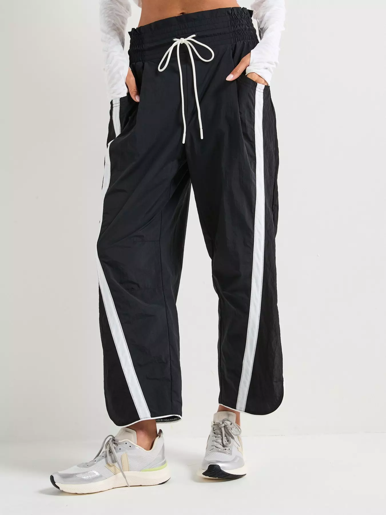 - Features: Durable, nylon fabrication; water-resistant; contrast piping detail throughout; elasticated waistband with smocking detail; adjustable drawstring at waist; 7/8 length hits above ankle; tulip-style bottom hem