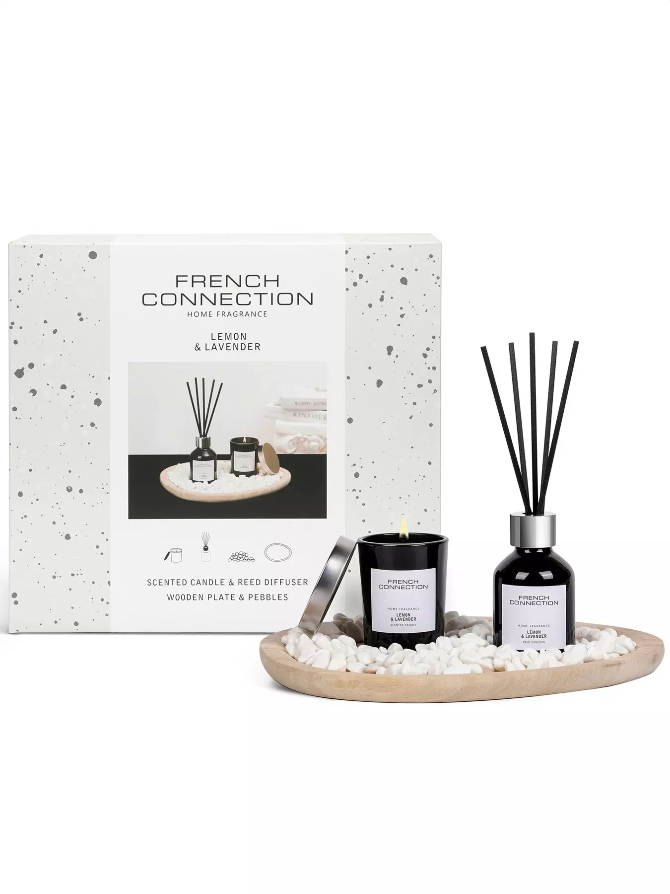 E.A.N: 5 0 5 6 7 9 1 6 0 3 6 3 5French Connection Lemon & Lavender Set - Contains Candle/diffuser/wooden Plate & Pebbles