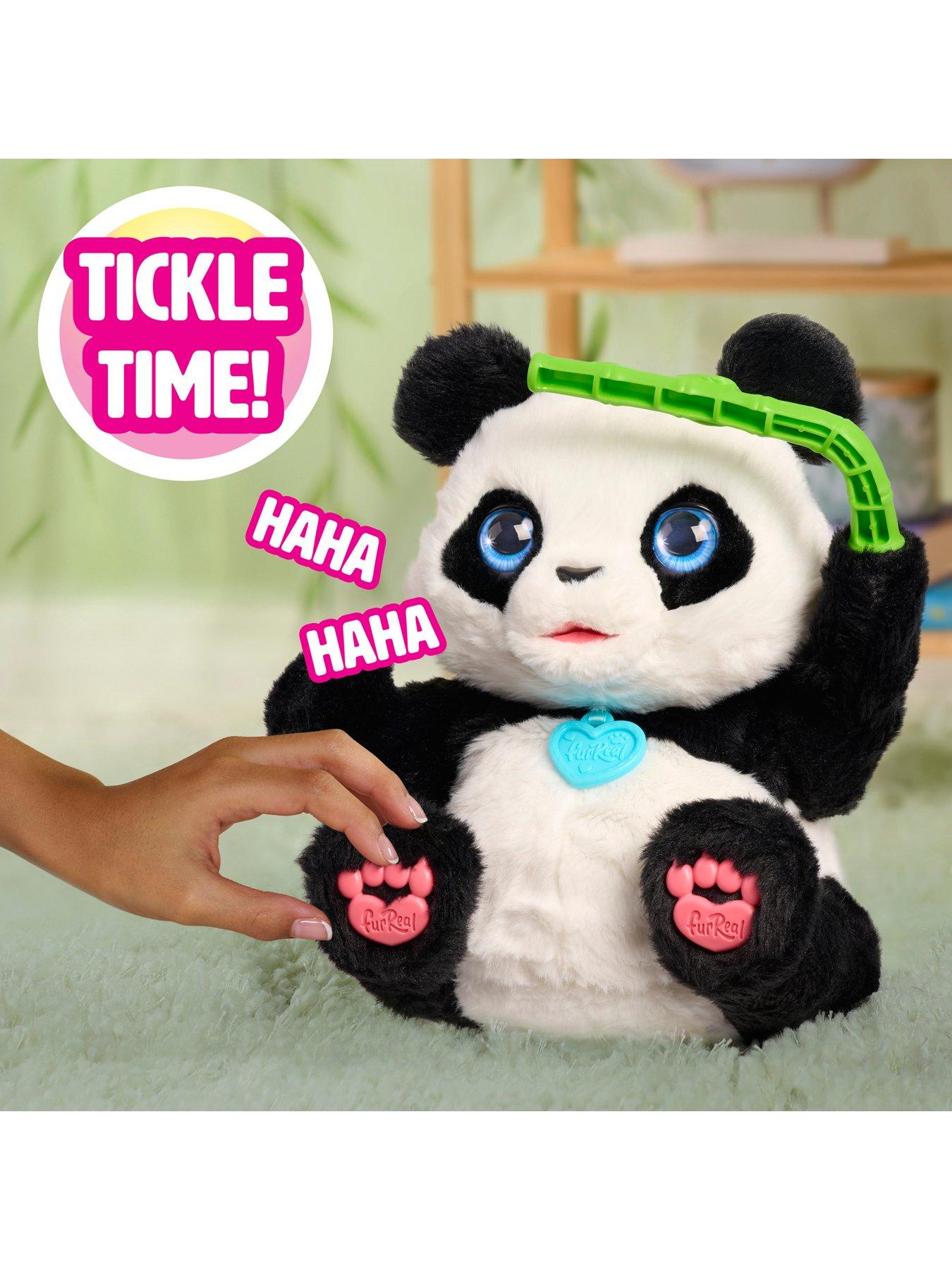 FurReal Friends furReal Coco the Tumbling PandaWhat's black and white and rolls all over? It's furReal Coco the Tumbling Panda interactive plush toy! This super-soft plush pal has a zest for life, and comes ready to play. With over 60 different sound-and-motion combinations, this 10.5-inch animated plushie is always up for a tickle game, a snack, and a good tumble. To begin play, slide the switch from TRY ME mode to ON. Tickle her right foot to activate giggles and wiggles. Keep it up to see Coco roll on her back with laughter. Pet her head to see her sit up - all on her own. Press the sensor on Coco's head to see a couple of practice rolls. Double-tap her head to see an amazing 5-roll combination. All that tumbling makes a panda hungry. Place Coco's toy bottle in her mouth to hear her drink. Lift the bamboo shoot she's holding toward her mouth to hear snacking sounds. Then, press and hold the sensor on her head. Coco will cuddle and fall asleep in a kid's arms. For more animal fun, collect additional furReal plush pet toys. Each sold separately. Requires 4 x AA batteries (not included). This adorable, animated kids toy makes a 'panda-tastic' surprise for animal lovers ages 4 years and up.