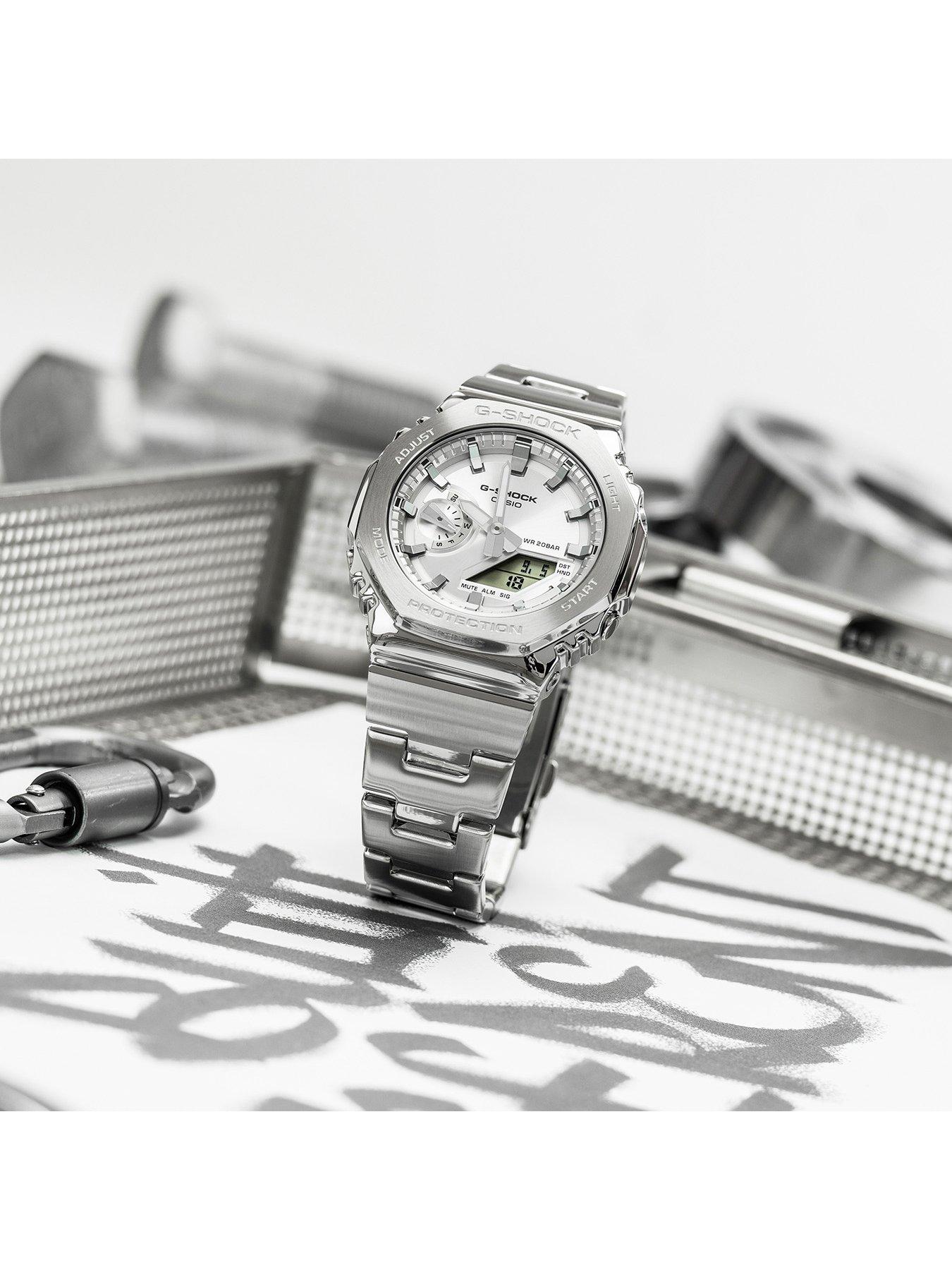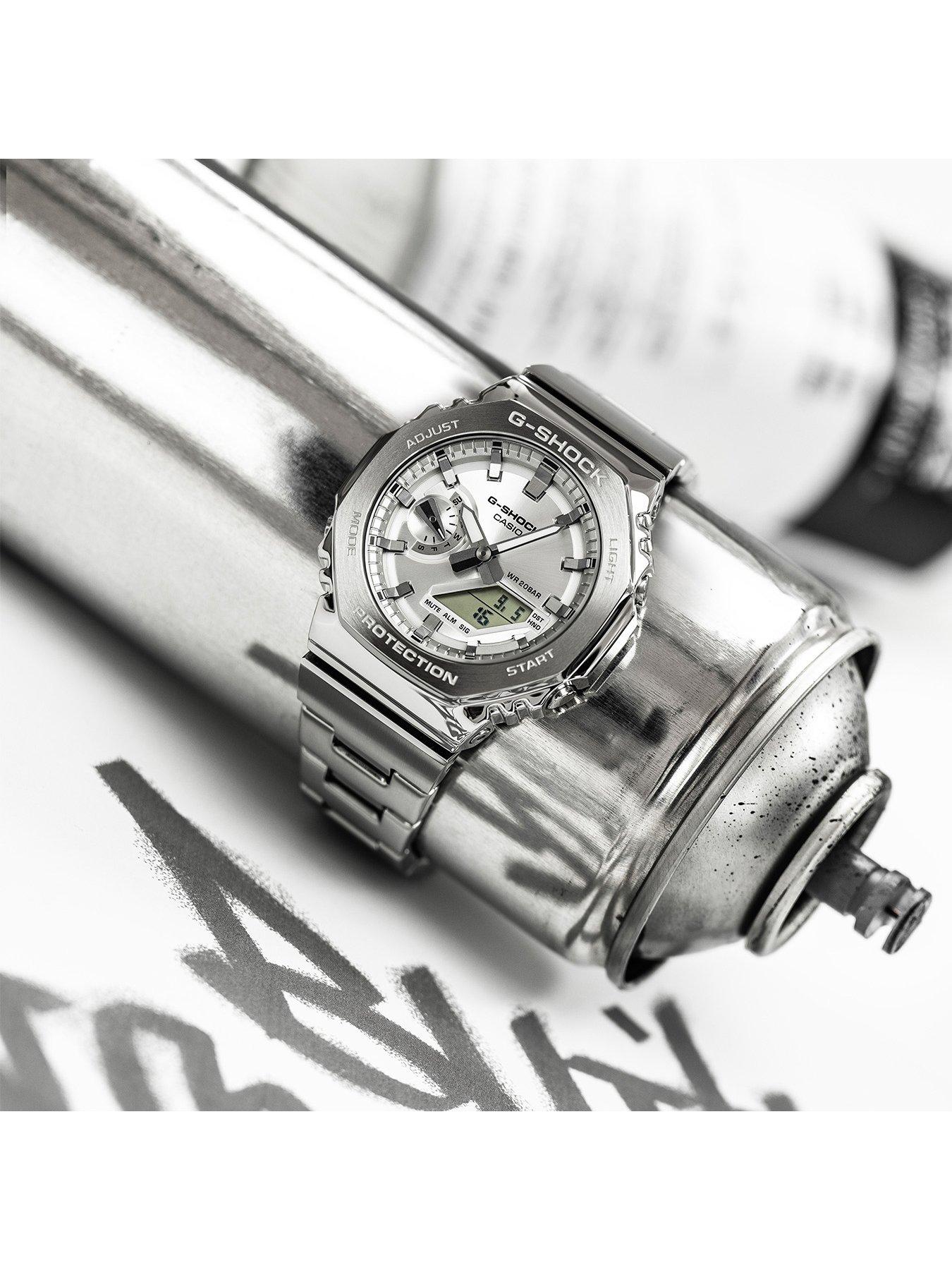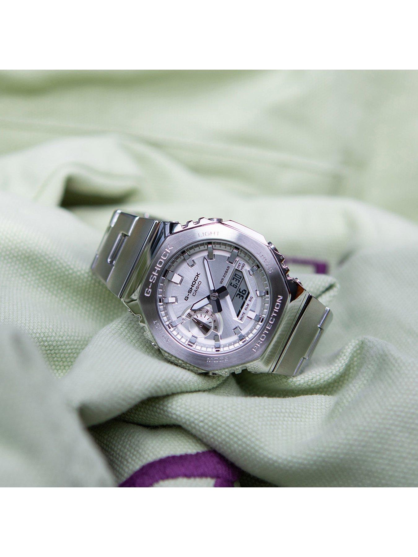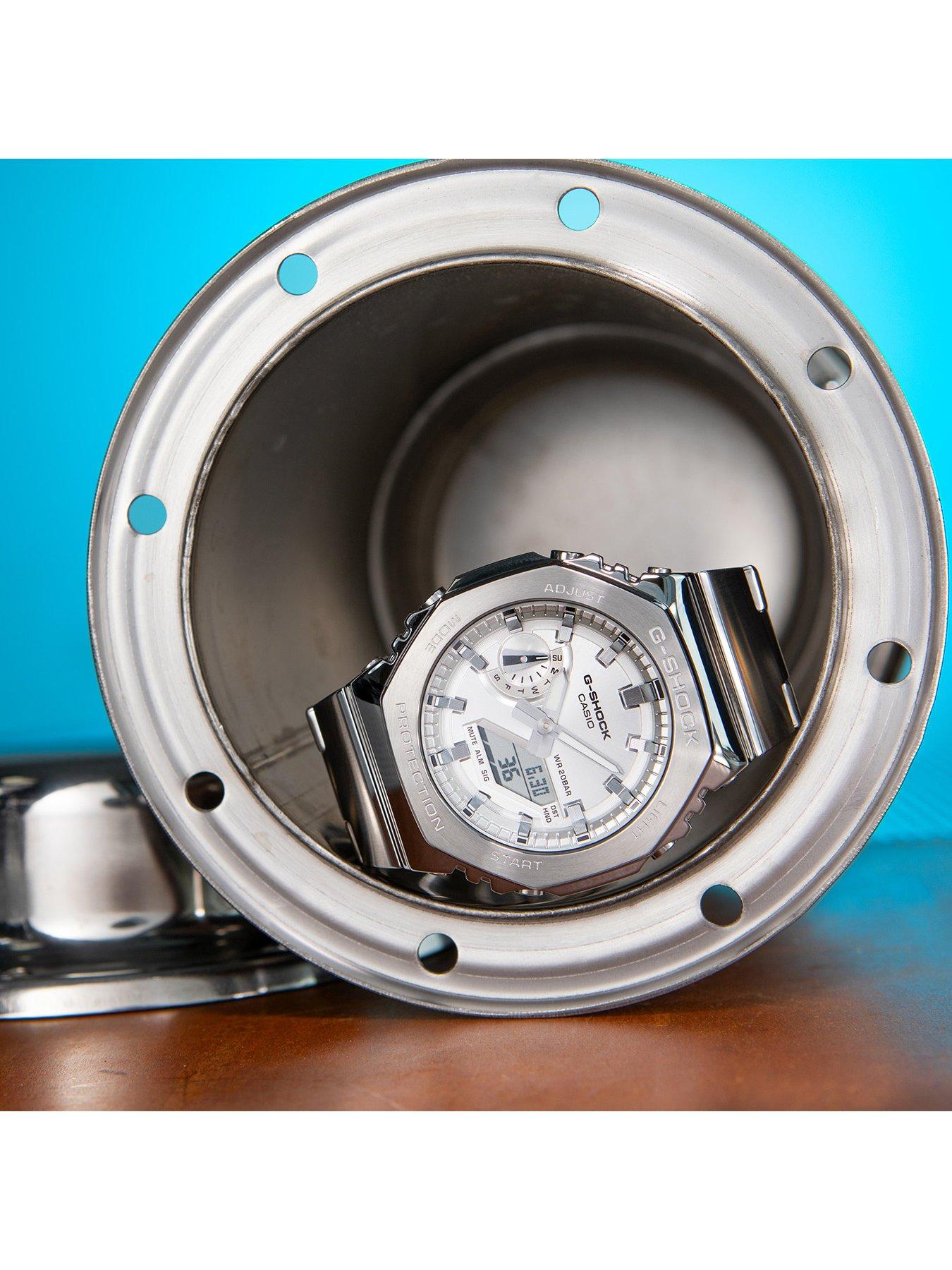 G Shock G-Shock GM-2110D-7AER Watch - Metal Covered RangeIntroducing the GM-2110D - an analog-digital combination G-STEEL based on the GA-2100, now with a stylish metal bezel and band update.Meticulously forged and polished, the uniform octagonal stainless-steel bezel anchors a simple, no-fuss design with a sophisticated, yet tough look. Made of high-rigidity glass-fiber-reinforced fine resin, the case is the slimmest of all G-SHOCK combination models, at just 11.8 mm. The metal band, together with a pop of fresh color from the metallic brass dial, is up for anything - work or play. Choose from, sky blue, orange, or lime green, in addition to classic hues of navy and silver. All with high-brightness double LED light, ensuring an easy read even in the dark.