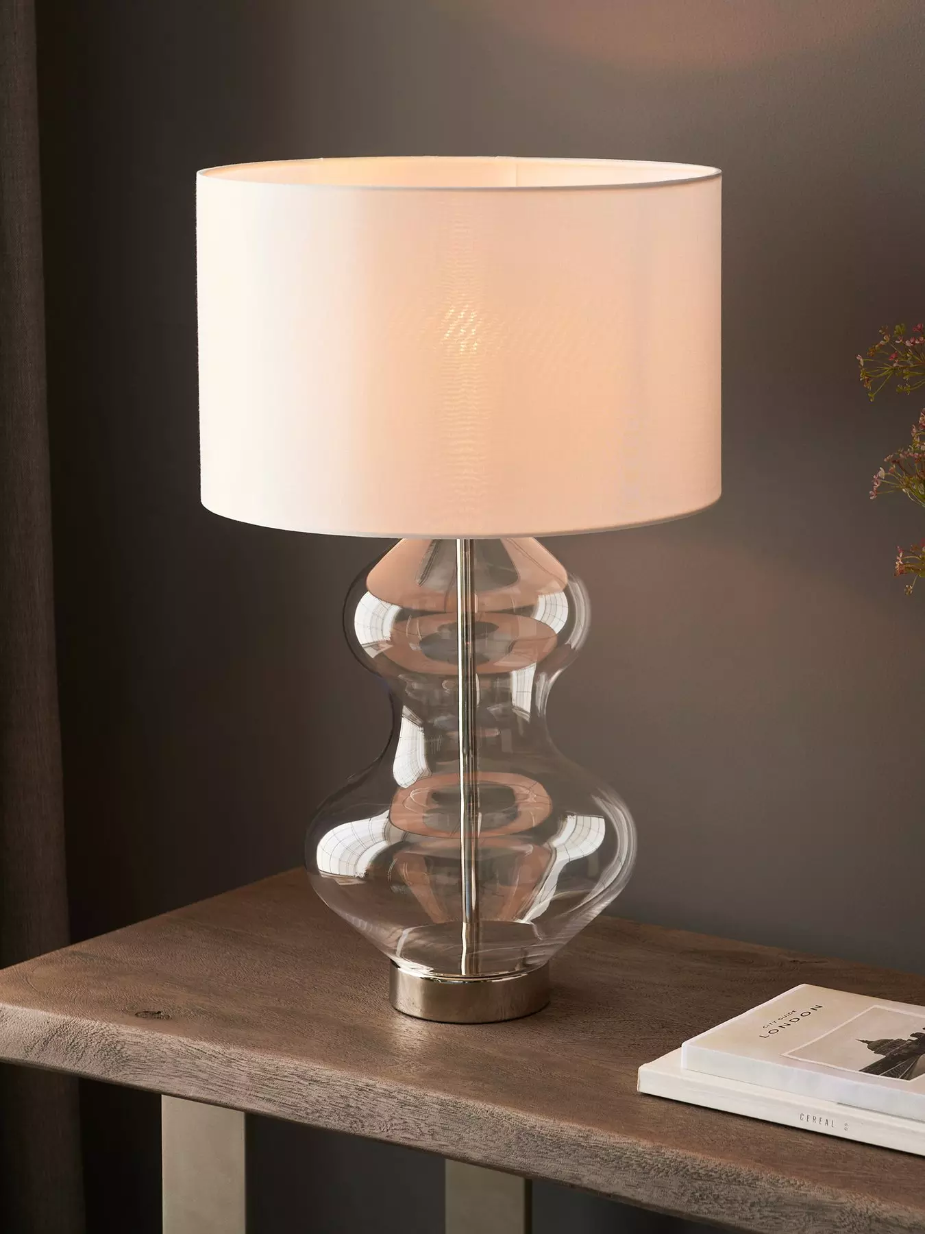 Elegant and extremely versatile, this classic table light features a clear glass base with a vintage white fabric shade. Its distinctive hourglass silhouette is the ideal partner for either contemporary or classic interiors. Available in satin brass or polished nickel with a three-stage touch dimmer.- Depth: 350 MM