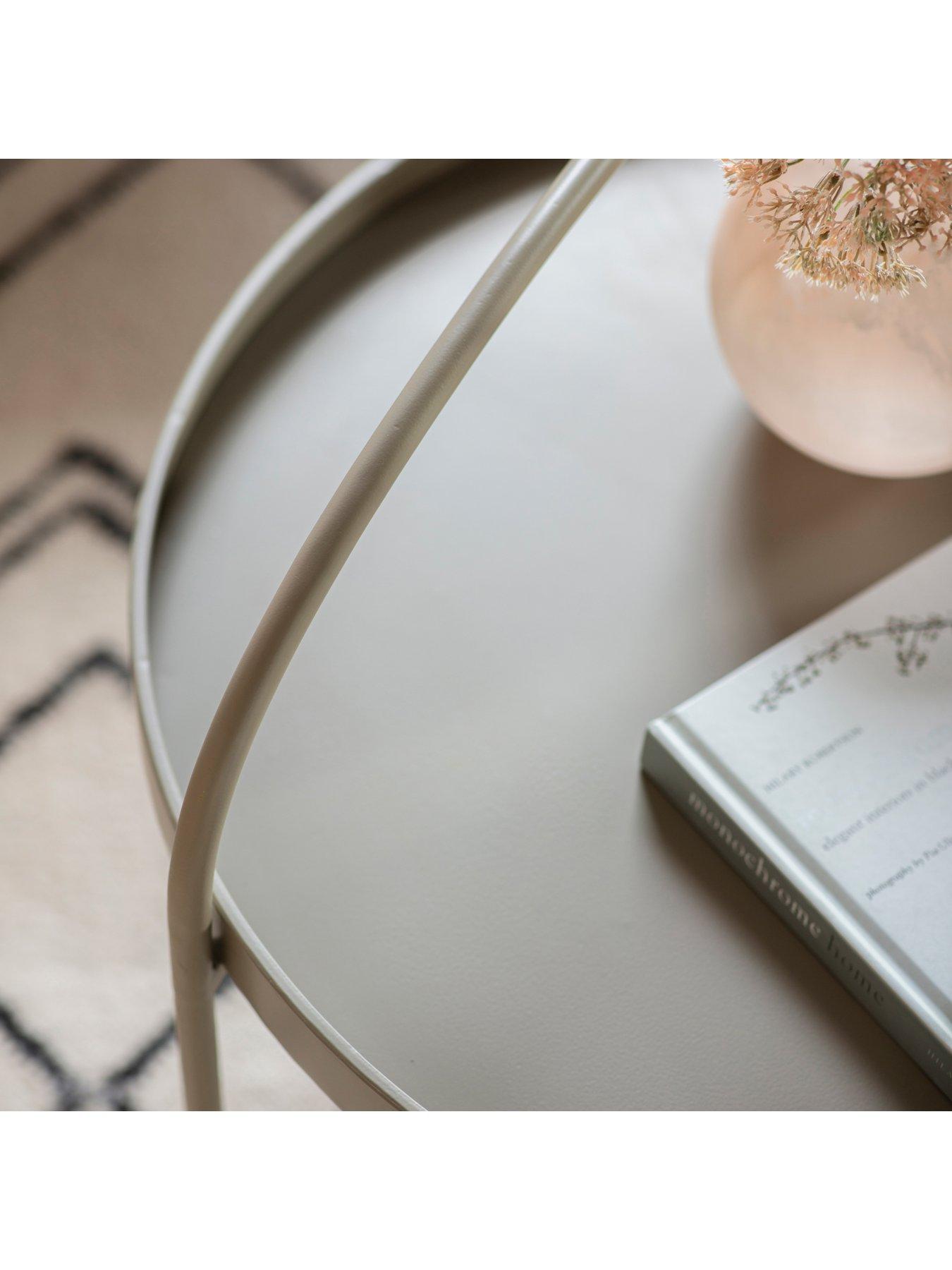 Gallery Direct Melbury Metal Coffee Table - LatteThe stylish design of this unusual coffee table features a tray-style top, which lifts off for added practicality, and a continuation of one section of the base, up and over the table to create a âhandle' effect. Both the tray top and base are made from metal with a painted finish. A matching side table is available. Both are offered in a choice of six colours, from eye-catching tones, which are ideal for adding a pop of colour to room, to softer colours, for those who prefer a more subtle look.