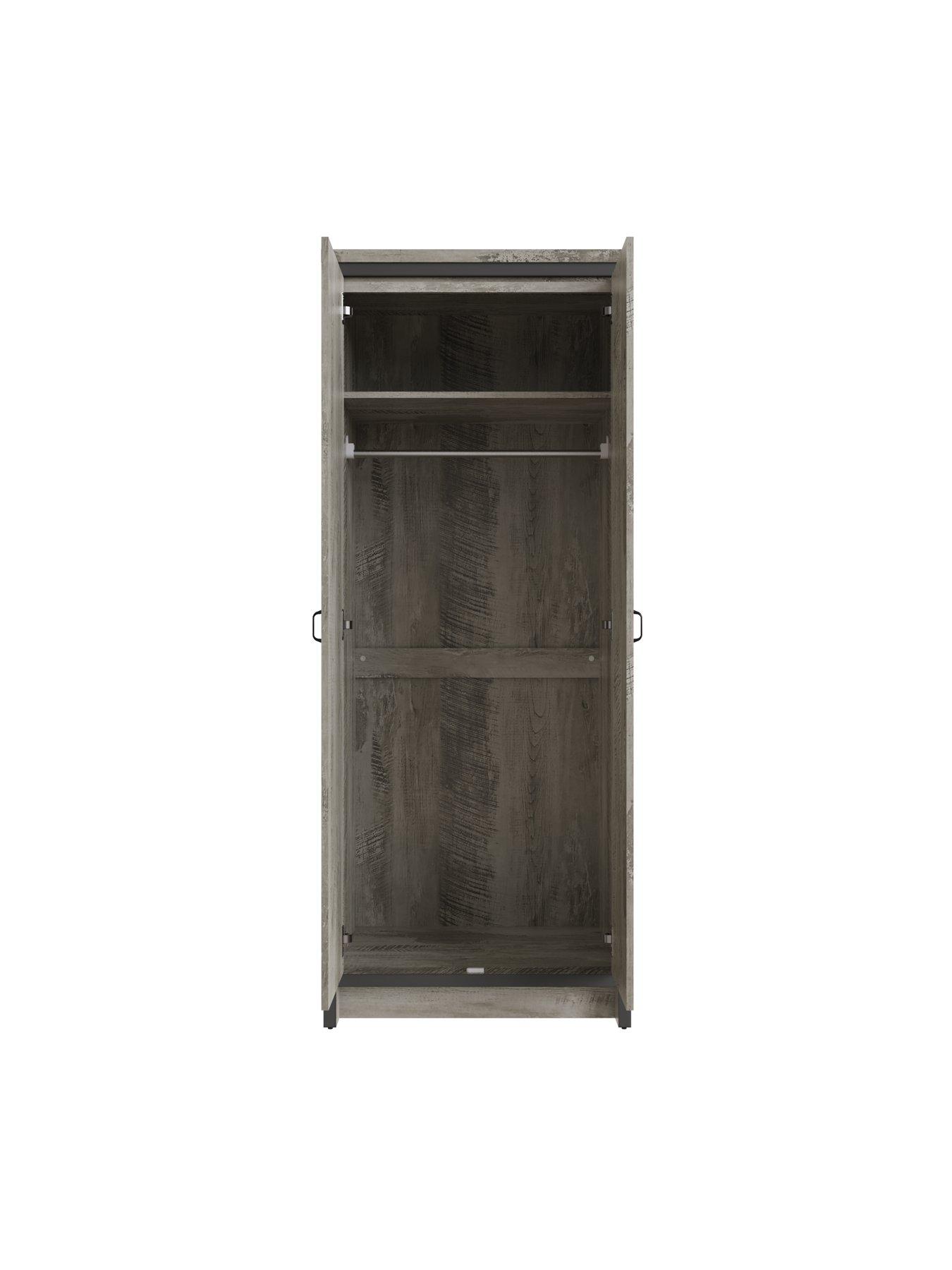 GFW Boston 2 Door WardrobeGive your bedroom a makeover with the stylish Boston Bedroom Range. The industrial-inspired design of the Boston is a good match for a contemporary interior, offering a pared-back, reclaimed-effect look and feel that reflects the urban aesthetic. The two-door wardrobe offers a full-length hanging space, with a spacious shelf above the hanging rail for extra storage. We know you'll love the combination of Boston's sturdy construction with the reclaimed-effect with the grey finish that creates such a bold industrial look.