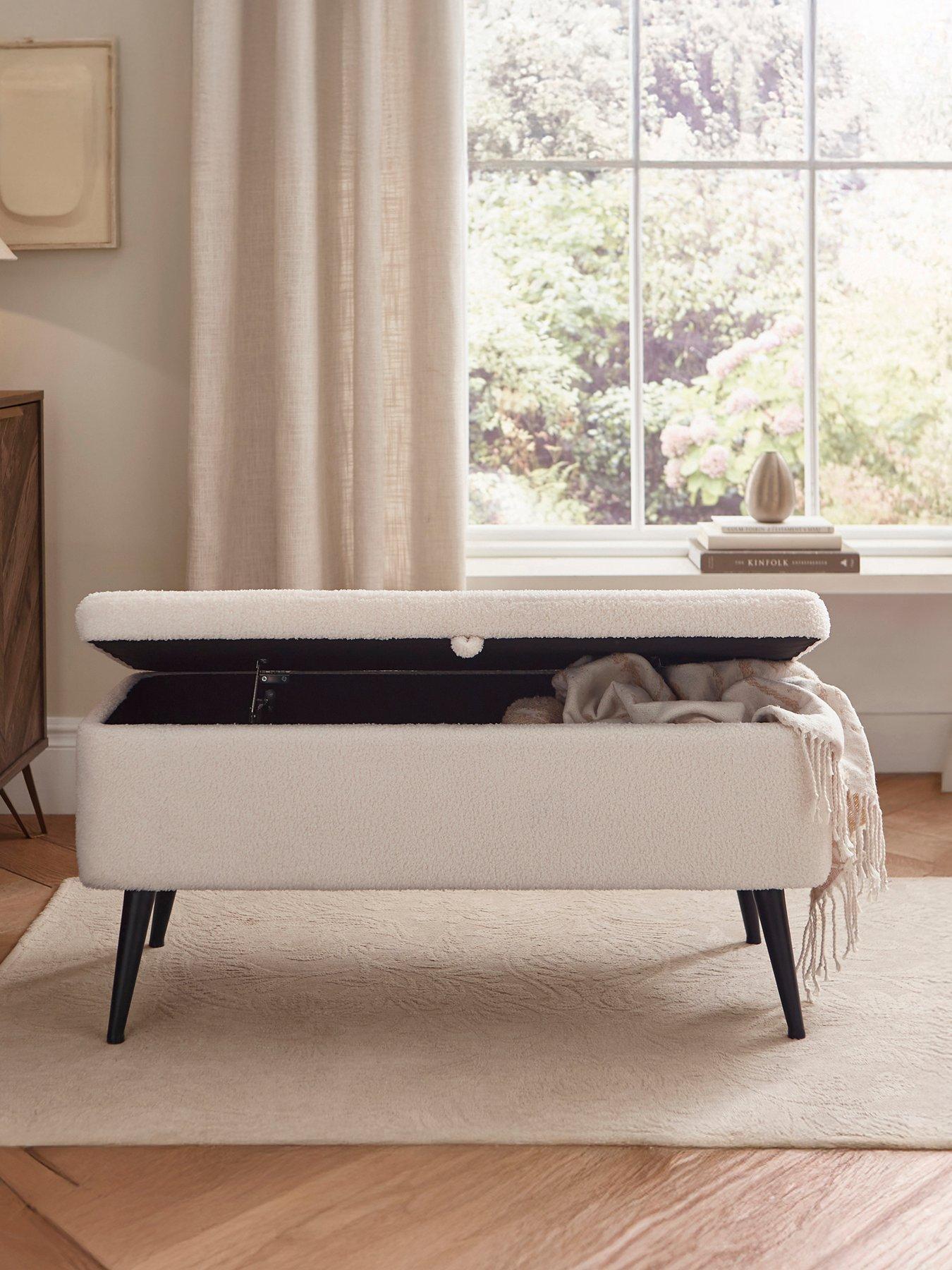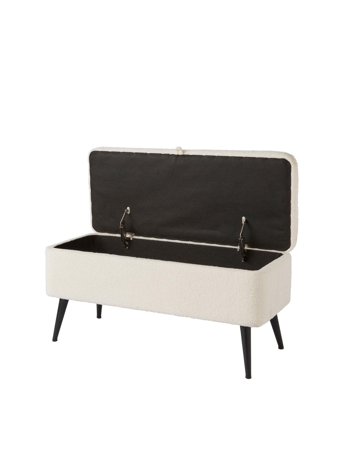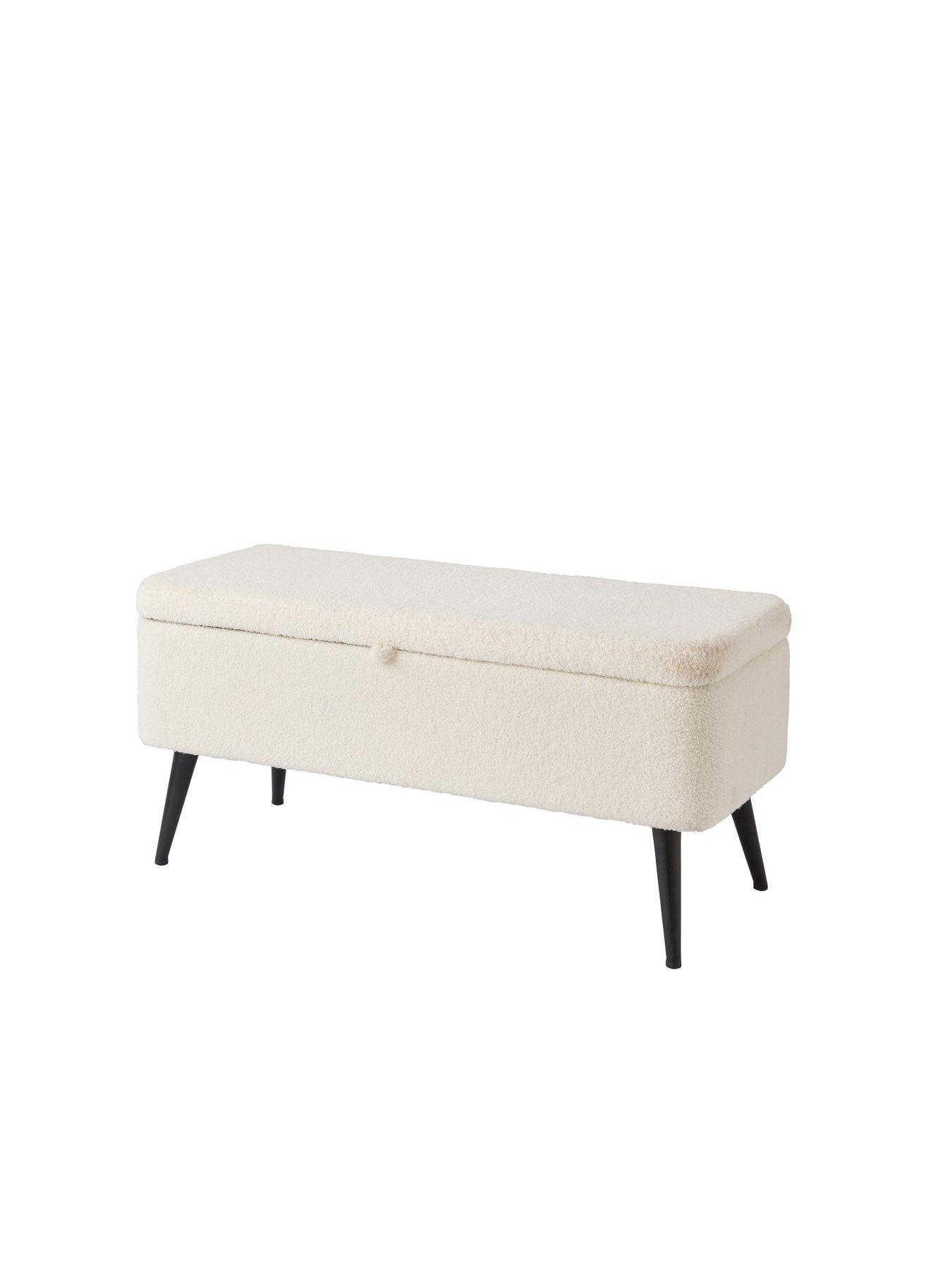 GFW Kaye Boucle OttomanSimple, stylish and highly functional - the Lola Storage Ottoman in Cream is the perfect finishing touch for bedrooms, living rooms or hallways. Upholstered in a cosy, textured Teddy style boucle-style fabric, Lola brings softness and subtle texture to your space. Lift the cushioned top to reveal generous hidden storage - ideal for blankets, shoes, or everyday clutter. Supported by slim black metal legs, its elevated design adds a modern touch while making cleaning underneath a breeze. A smart storage solution with understated charm.