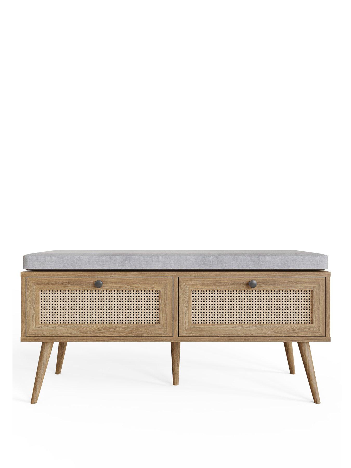 GFW Noor 2 Drawer Shoe CabinetBring effortless elegance and functionality to your entryway with the Noor 2 Drawer Shoe Cabinet. Oak finish and woven rattan fronts, this stylish cabinet blends modern minimalism with bohemian warmth. The cushioned top provides comfortable seating while you put on or remove shoes, and the two spacious drawers offer storage to hold up to 4 pairs of shoes making your hallway organised and your space clutter-free.Â