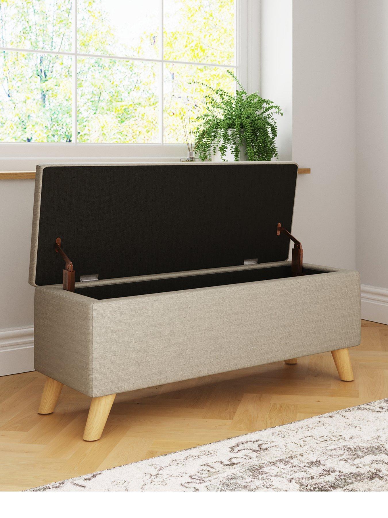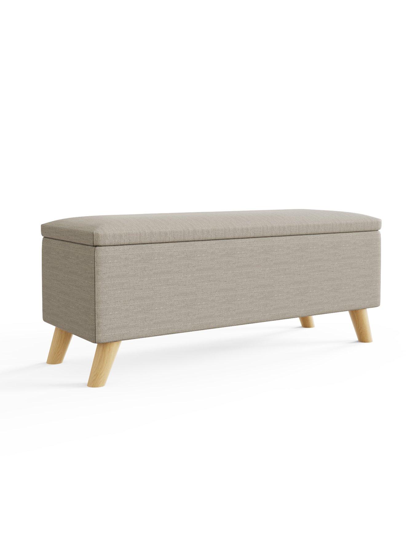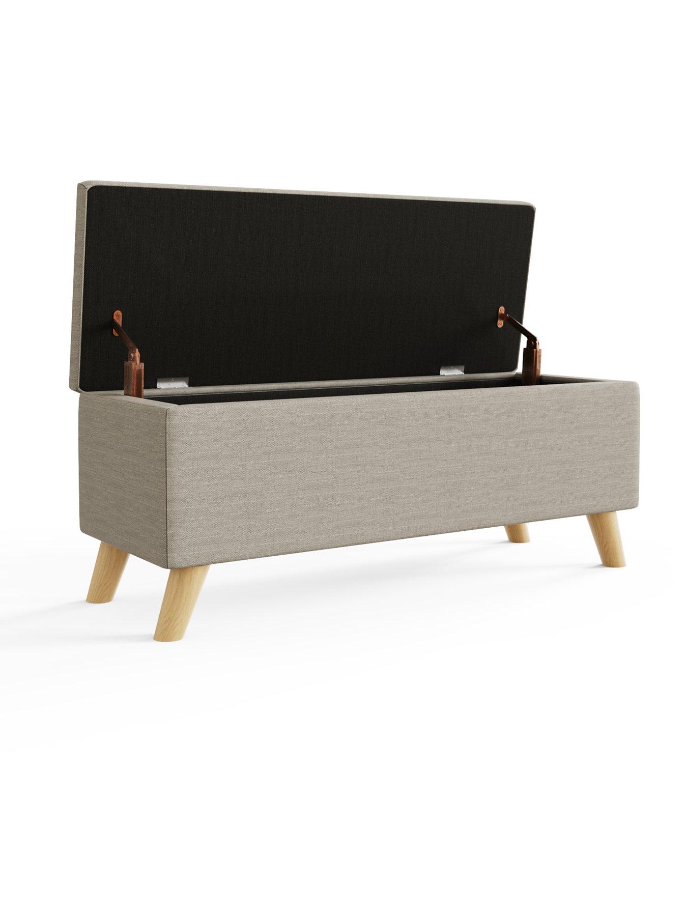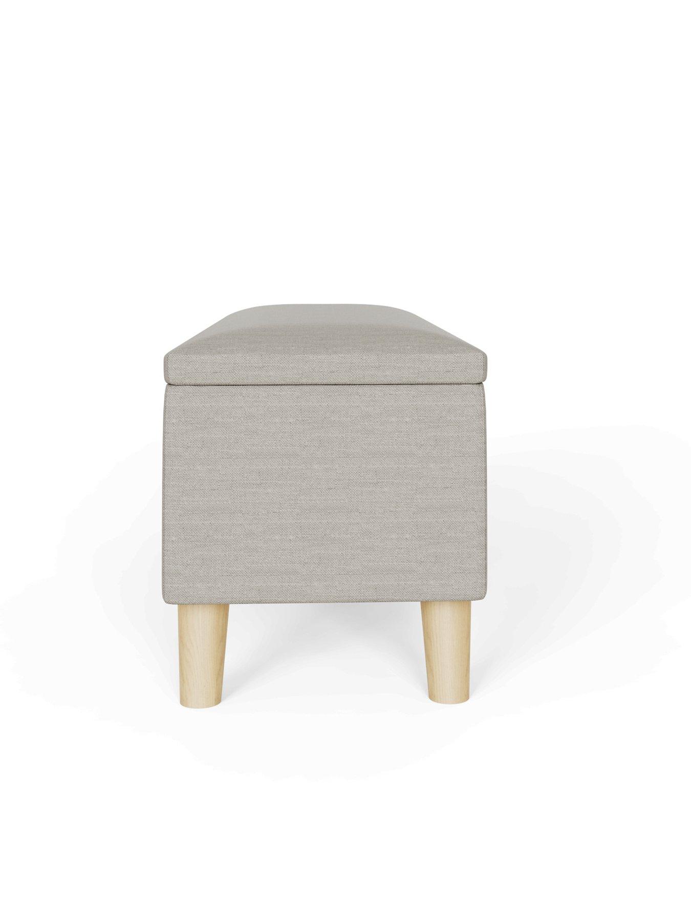 GFW Secreto OttomanAn ottoman like the Secreto is a clever and stylish addition to any home. Upholstered in a fabric finish, it offers convenient extra seating while discreetly concealing spacious internal storage perfect for keeping bedding, throws, or children's toys out of sight. Ideal for placing at the foot of a bed or beneath a window, it adds a modern touch with its sleek fabric upholstery and contrasting wooden legs. Simply lift the lid to access the hidden storage inside