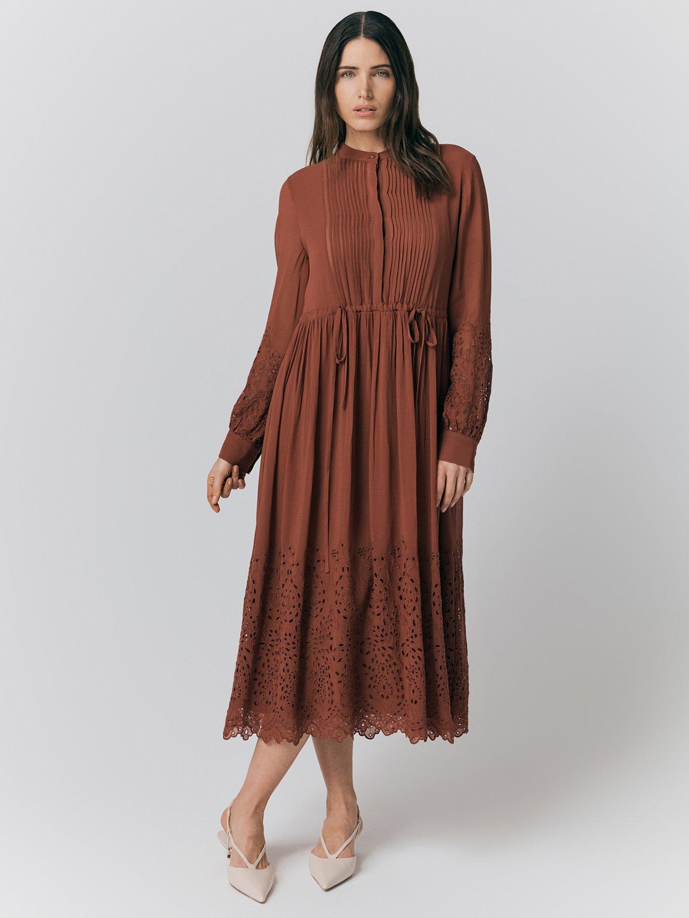 Ghost Millie Cutwork Embroidered Georgette Dress - RustLong sleeves, crew neck, embroidery detailings, tie fastening at waist for a fitted look