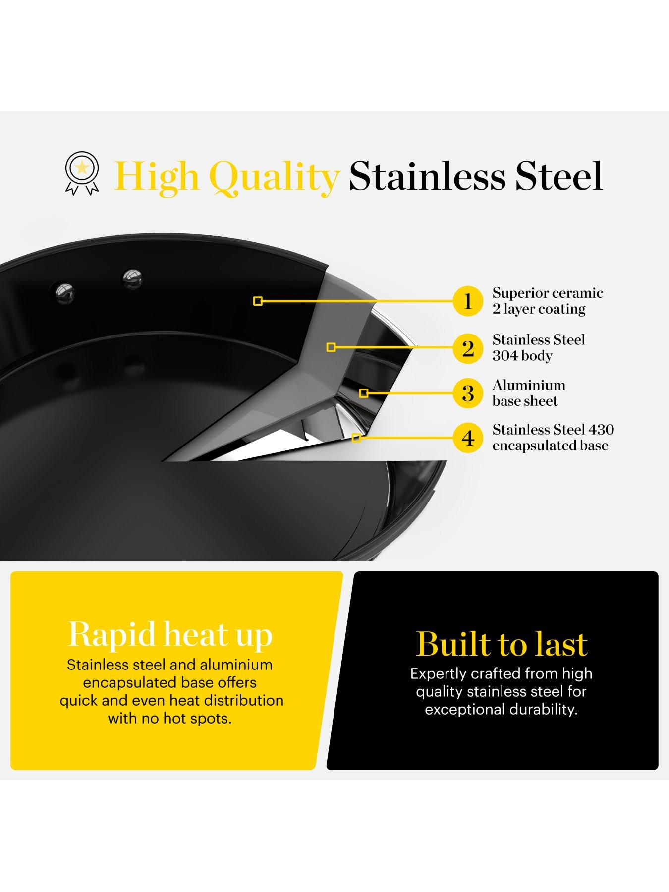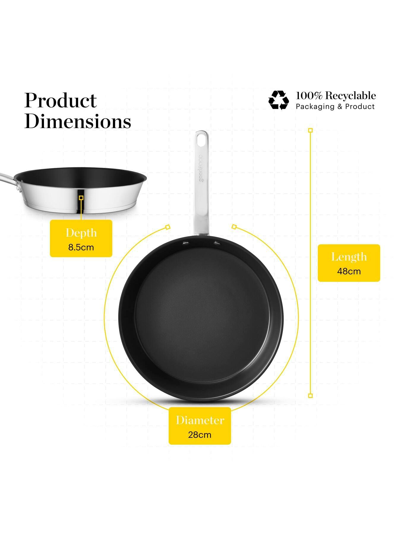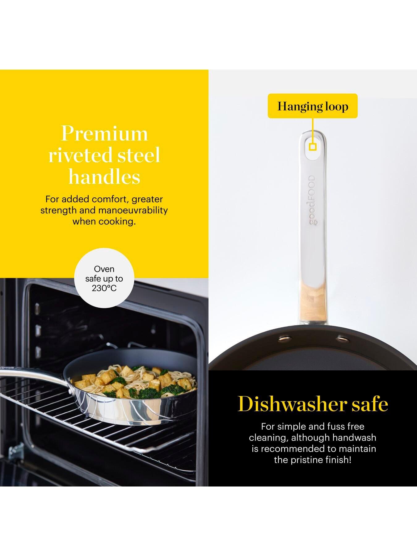 Good Food 28cm Frying PanGet the most out of your mealtimes with this 28cm frying pan from Good Food in partnership with Tower. From fluffy pancakes to fried eggs, this pan is specially designed to perfectly cook a wide range of delicious dishes from our vast online Good Food recipe library. Durable and built to last, this high quality stainless steel frying pan is great for novices and seasoned pros alike. Its superior ceramic non-stick coating requires little to oil and is free from PFAS, PFOA, PTFE, lead and cadmium for healthier cooking. Dishwasher safe, handwash recommended. GOOD FOOD TRIED & TESTED Capable of creating a variety of flavourful dishes, from pancakes to fried eggs, this frying pan is ideal for family cooking. All products from Good Food in partnership with Tower have been Tried and Tested by our expert Recipe Development Team to ensure they work perfectly with our vast online library of over 15,000 unique recipes SUPERIOR CERAMIC COATING Our Superior Ceramic non-stick coating is 10x stronger than traditional non-stick coatings and offers superior food release and healthier cooking with little to no oil required. It is free from PFAS, PFOA, Cadmium & Lead and it is safe to use nylon, wood or silicone utensils without damaging the non-stick coating. PERFECT & VERSATILE COOKING The stainless steel & aluminium encapsulated base offers quick & even heat distribution so food is perfectly cooked with no hot spots. You can also use the pan on any hob type, including induction for great cooking versatility. The pan is oven safe up to 230°C, so they're perfect for use with the vast Good Food online recipe library 10 YEAR GUARANTEE Professional quality with a standard 1 year guarantee and a 9 year extension, subject to product registration online (Ceramic coating has a 5 year guarantee