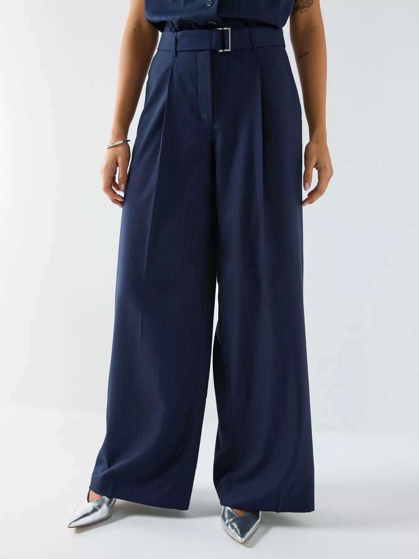- All-over pinstripes embellished with metallic fibre
