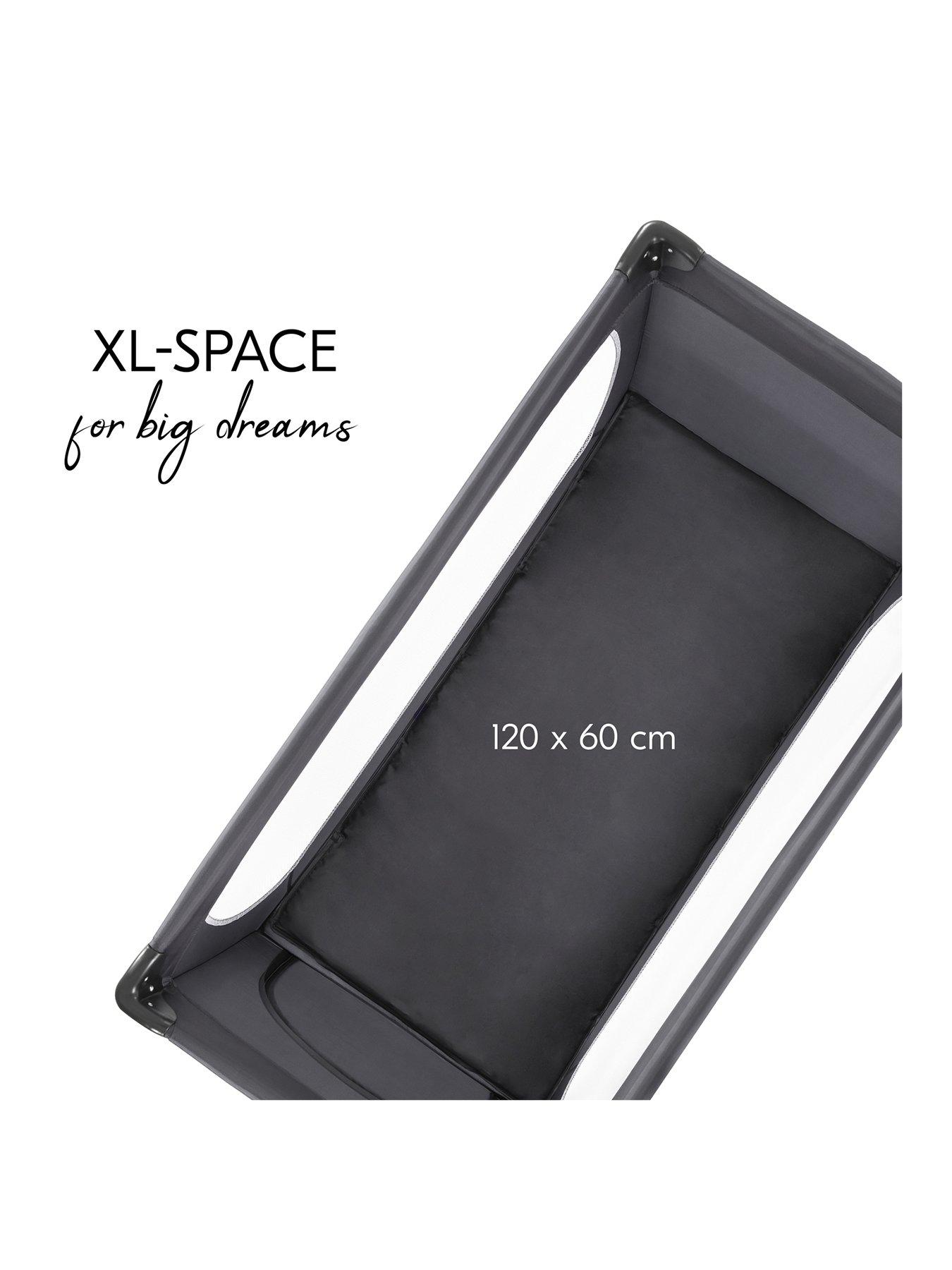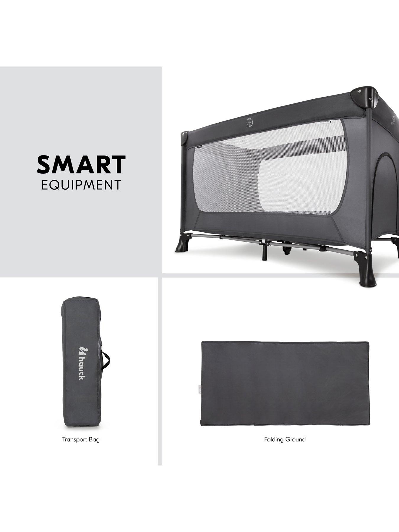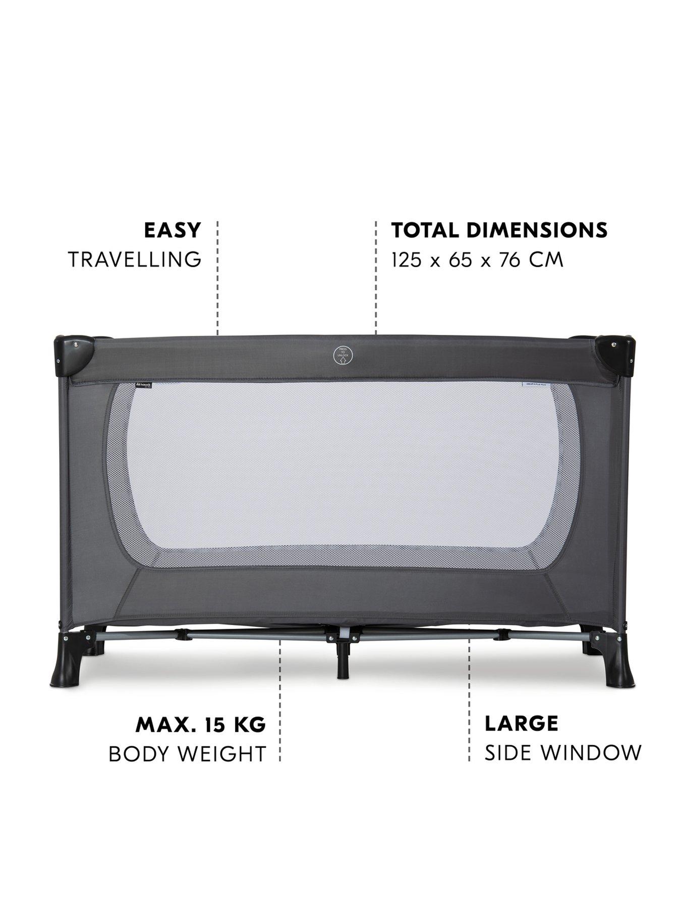 Hauck Dream N Play Plus Travel Cot- GreyThe Perfect Travel Bed. The versatile Dream N Play Plus Travel Cot features large viewing windows and a practical side exit. Your child can crawl out of it independently through the hatch, making it ideal as a fun playpen for older toddlers. The Dream N Play Plus can be set up and folded down in no time and its small folder size allows it to be stored away easily, or taken away with you when travelling or visiting grandma and grandpa. It gives your child the necessary feeling of security on your trips. Both the padded folding base and the practical carrying bag are included in the delivery. The Dream N Play Plus travel cot has a sleeping area on 60 x 120cm, making it compatible with a standard size cot mattress (sold separately) if you want to use the travel cot for an extended period. (Max depth of mattress 10cm)