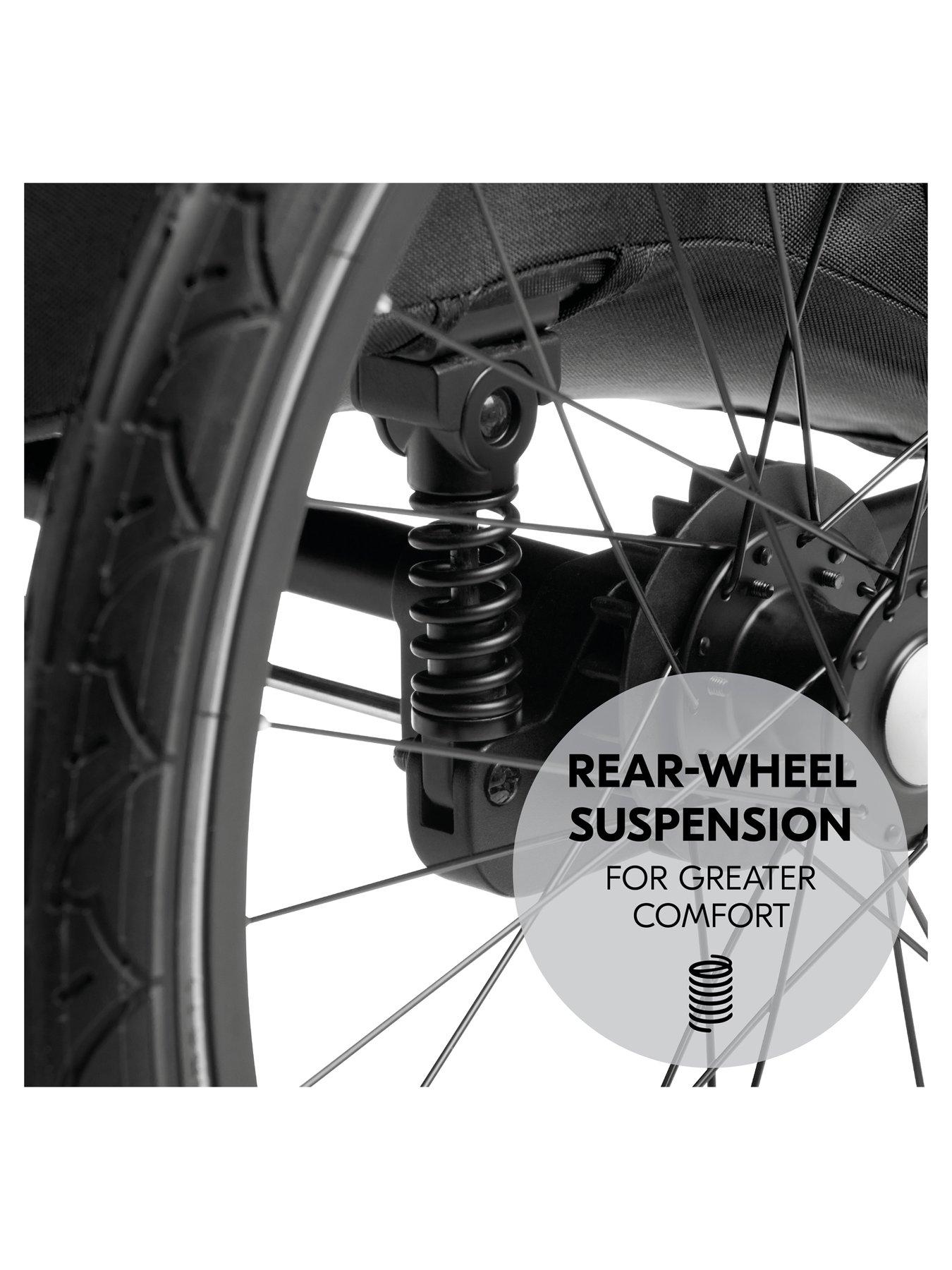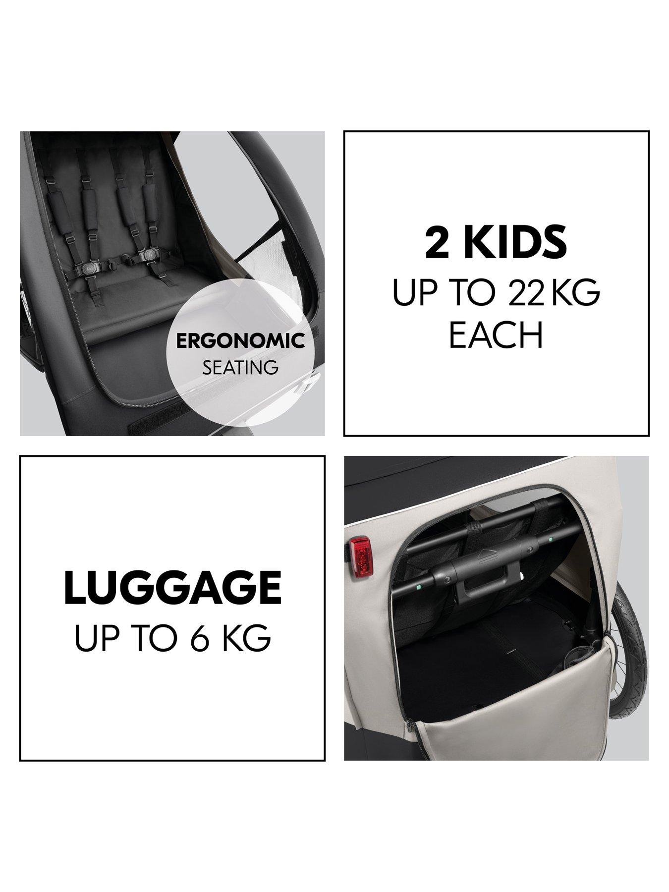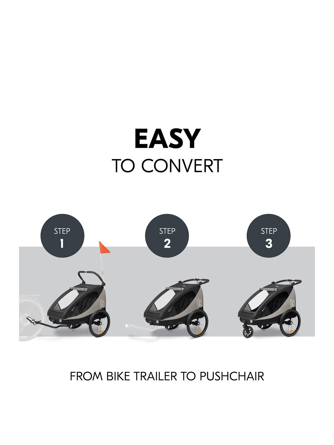 Hauck DRYK Duo Plus - BlackBike trailer and pushchair in one Quickly converted and coupled Are you on the road a lot, and you need a bike trailer that easily transforms into a pushchair? And which you can quickly attach to your bike? Then the Dryk Duo Plus is perfect for you! With rear suspension for a lot of comfort On the curb, off the curb, over cobblestones - it doesn't matter! In the Dryk Duo Plus with rear suspension and pneumatic wheels on the rear axle, your children will sit comfortably even when the going gets bumpy. Lots of space for children and luggage Your children will love getting in here! The ergonomics of this comfortable two-seater are now even better, so they will have even more space for their feet. Our tried-and-tested, height-adjustable 5-point harness system keeps your child safely strapped in. And the large storage compartment holds everything you need to take with you. Even easier to push With its new brakes, the Dryk Duo Plus gives you even more leg space. The height-adjustable handlebar with 8 positions adapts to you, and the rubber swivel wheel also helps make tight turns easy. With the wrist strap, you always have control of your speed. Transportation made easy The Dryk Duo Plus makes it easy for you! You can fold it up compactly - with just one hand. Transport lock and two pockets for the front wheel and drawbar guarantee extra comfort.