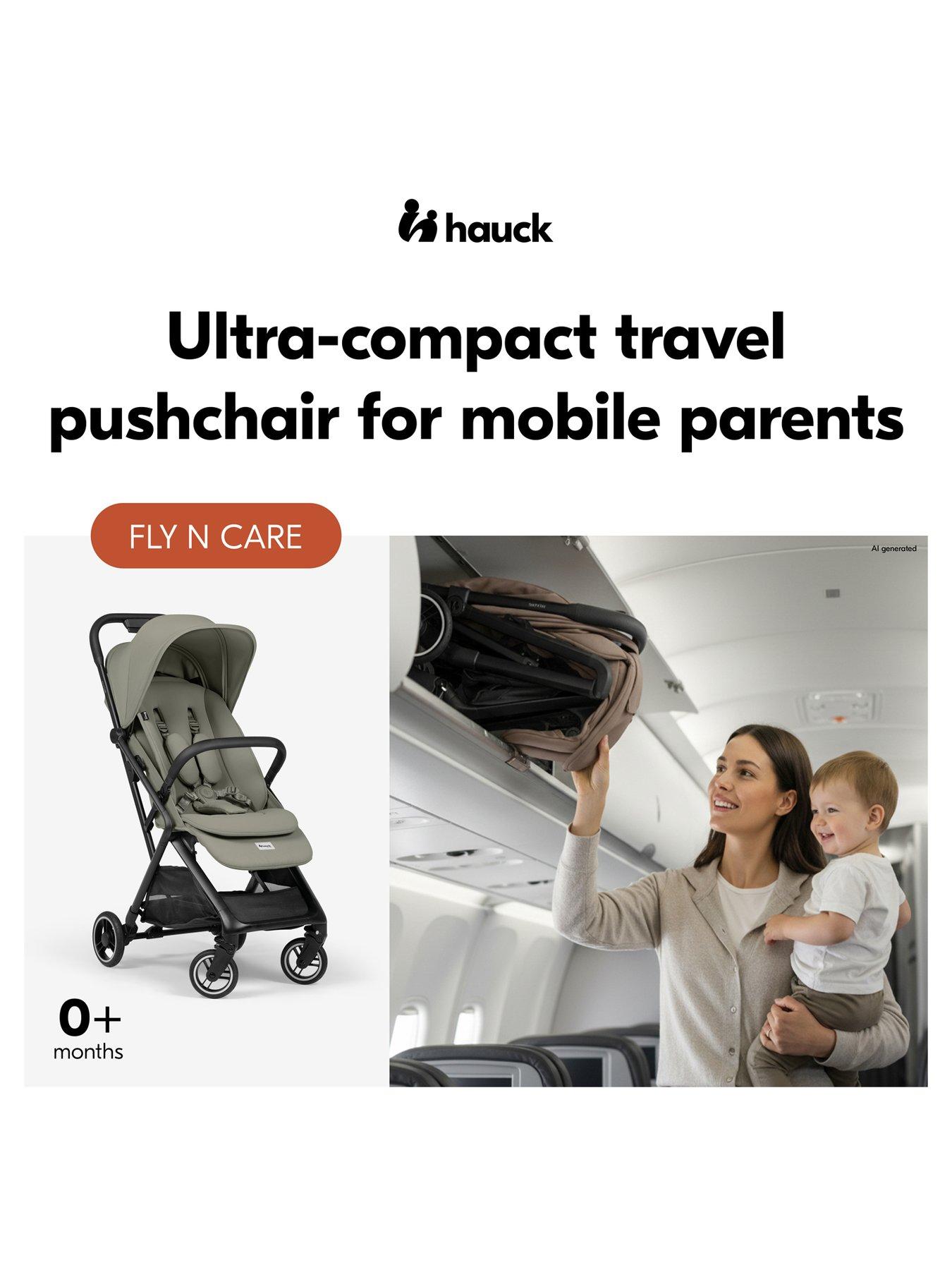 Hauck Fly N Care Stroller - Sage GreenUltra-compact travel pushchair for mobile parentsPerfect for train and plane The hauck Fly N Care is built for life on the move. Weighing just 7.5Â kg, it fits most overhead compartments. Auto-fold allows one-handed folding and shoulder carry. Folded size (55 Ã 45 Ã 24.5Â cm) meets IATA guidelines. Check airline rules to confirm. Modern, practical, stylish The Fly N Care has it all: shoulder strap, transport bag, seat liner, and car seat adapter* - ready from day one. Leather-look handlebar and bumper bar add a premium finish. Comfortable and secure Thanks to the one-handed adjustable backrest with reclining position, soft seat pad, and 4-way suspension on the puncture-proof EVA wheels, your child enjoys comfort from birth up to 22 kg. The removable swivel bumper bar makes getting in and out easy. The easily adjustable 5-point harness keeps your little one safe! XL sun canopy and ventilation The extendible sun canopy (UPF 50+) provides a pleasantly shaded spot for your baby. Large mesh inserts ensure excellent air circulation. Seat cover and liner are washable. *Compatible only with Cybex Cloud Z / Z2, Cloud T and Maxi Cosi Pebble, Pebble S, Pebble Pro, Pebble 360, Pebble 360 Pro2. Not compatible with hauck Drive N Care.