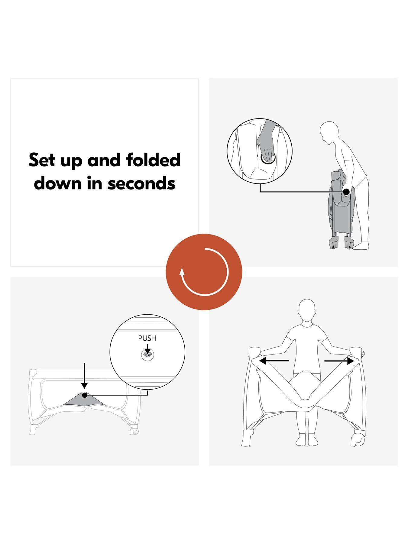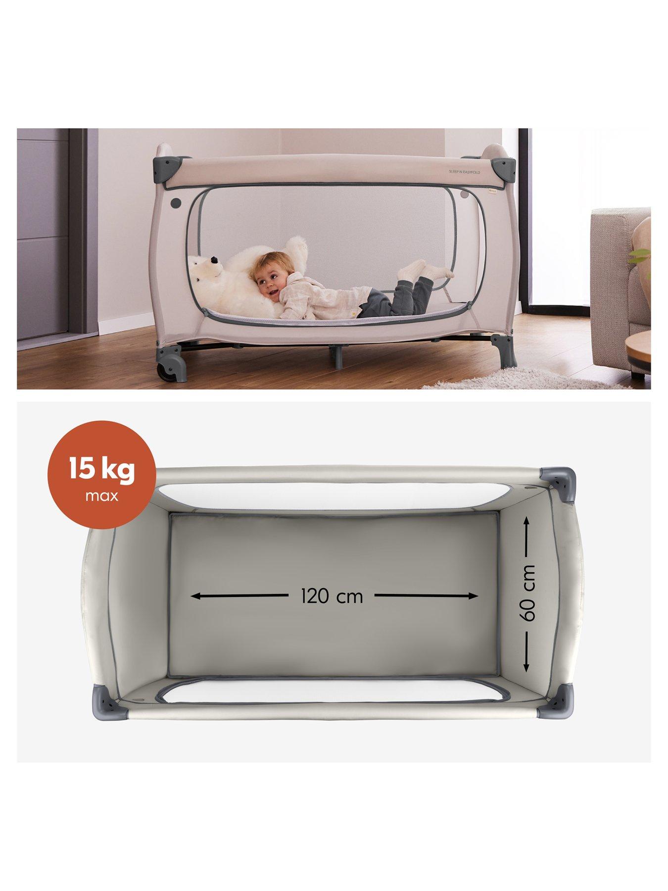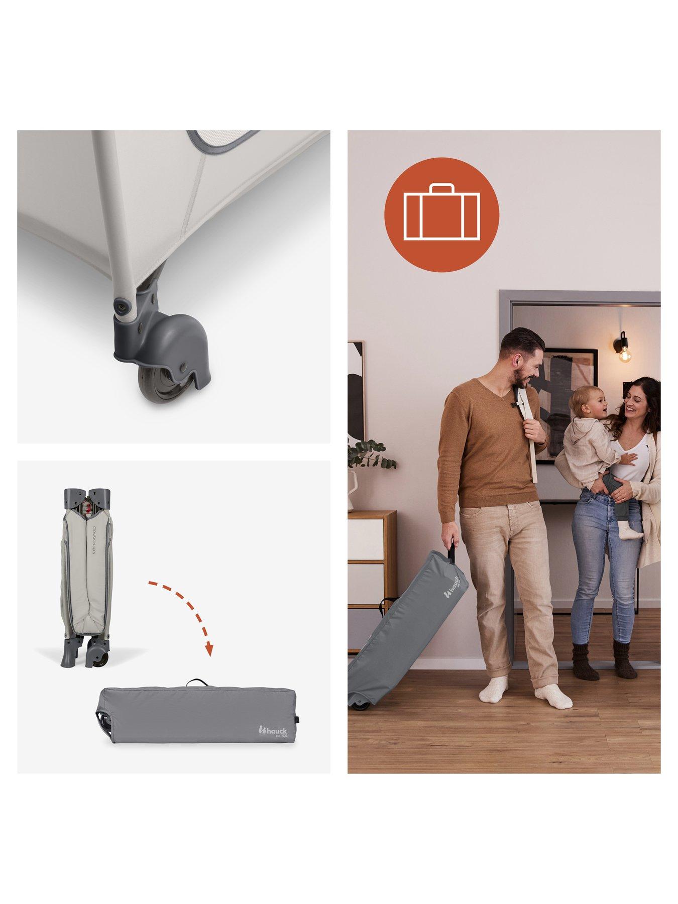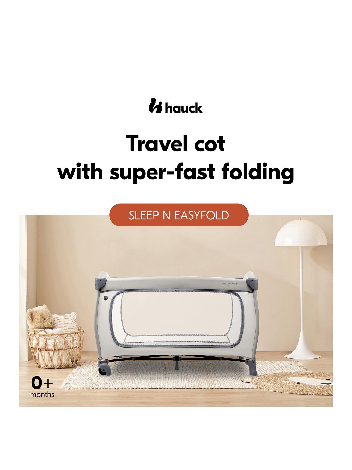 Hauck Sleep N Easy Fold Travel Cot - GreyTravel cot with innovative folding mechanismQuick to set up and take down The Sleep N Easyfold features an innovative folding system that makes setup simple. It opens and folds away in just a few easy steps. Two built-in wheels make it easy to move, whether set up or packed away in its transport case. And space-saving organiser makes it ideal for families on the go. Comfort on the move From birth up to 15 kg, your little one stays safe and snug in the Sleep N Easyfold - a true home away from home. Designed for restful sleep wherever you go, it creates a cosy, secure space for your baby. Two large mesh windows ensure optimal airflow and a comfortable climate. Whether you're at home or travelling, your child stays snug and well-ventilated. Extra-large hatch Children love to explore. The Sleep N Easyfold includes a large hatch that opens from the outside: your child can crawl out and back in again. Great fun! Optional accessories Transform the cot into a play tent with the Hauck Travel Bed Cover. Also available: Hauck Sleeper folding mattress