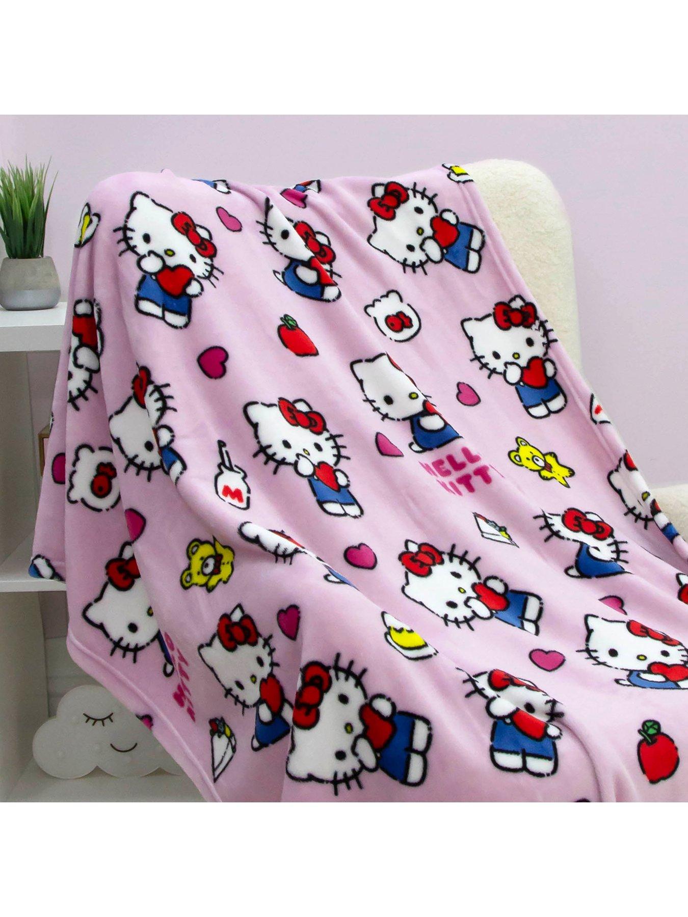 Officially licensed by Hello Kitty, this fleece blanket features Hello Kitty holding love hearts, teddy bears and milk bottles on a pink background