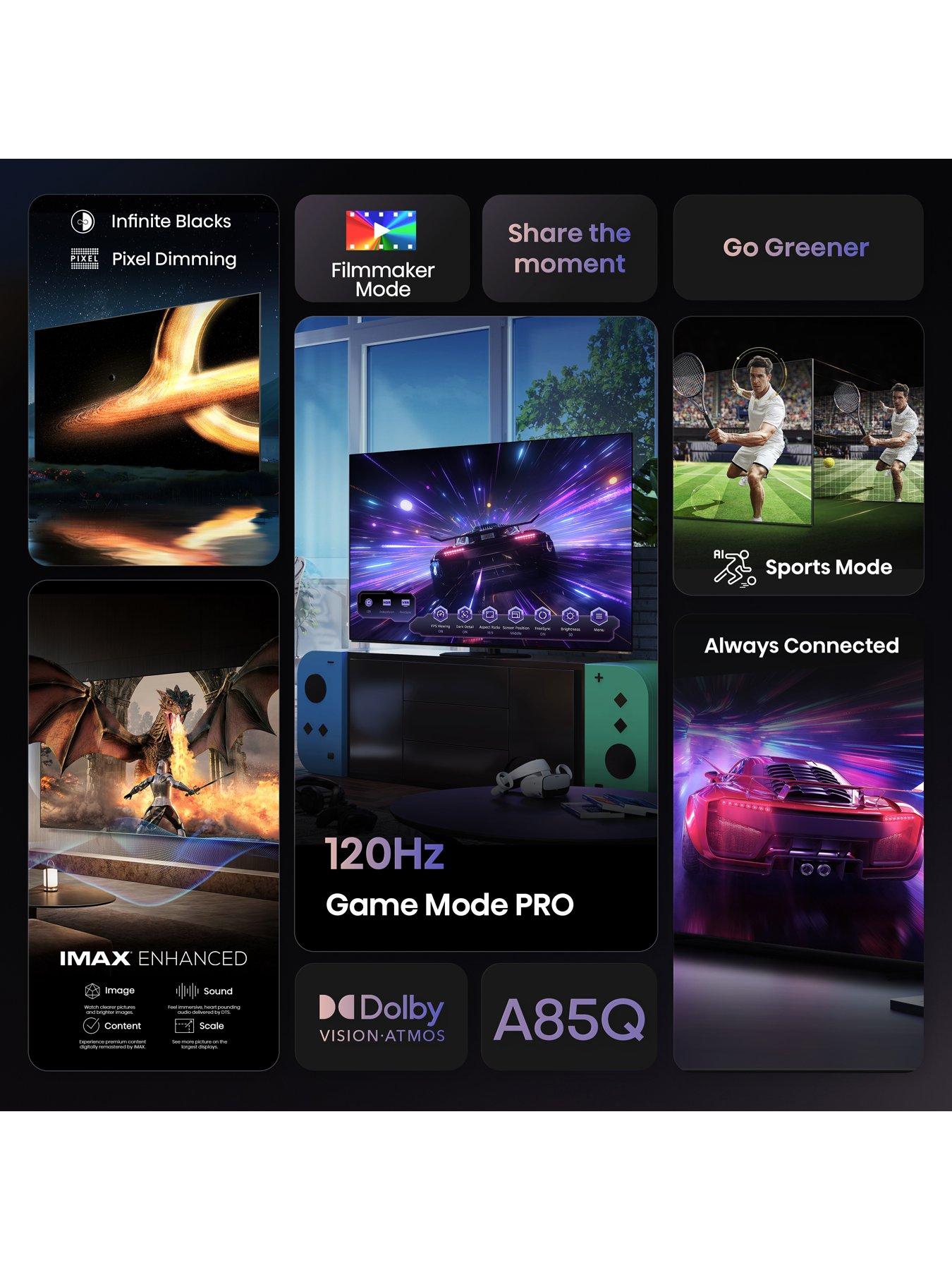 65" 65A85QTUK OLED Smart AI TV with FreelyImmerse yourself in stunning visuals with OLEDs self-lit pixels delivering infinite blacks and enhanced contrast. Experience cinematic audio with Dolby Atmos and a built-in 2.0 channel subwoofer, creating a rich, surround sound experience. Gamers can enjoy seamless, lag-free gameplay with 120Hz Game Mode PRO, ALLM, VRR, and AMD FreeSync Premium PRO. For movie lovers, Filmmaker Mode preserves the directors vision, while IMAX Enhanced ensures breathtaking clarity with reduced noise and grain. Sports Mode brings every moment to life with stadium-like realism. The VIDAA U8.5 Smart platform provides effortless access to top streaming services like Netflix, Disney+, and Prime Video, all navigated easily with hands-free voice control or our always-charged solar remote. Stay connected with built-in WiFi and Bluetooth, and cast content from your mobile device with ease.