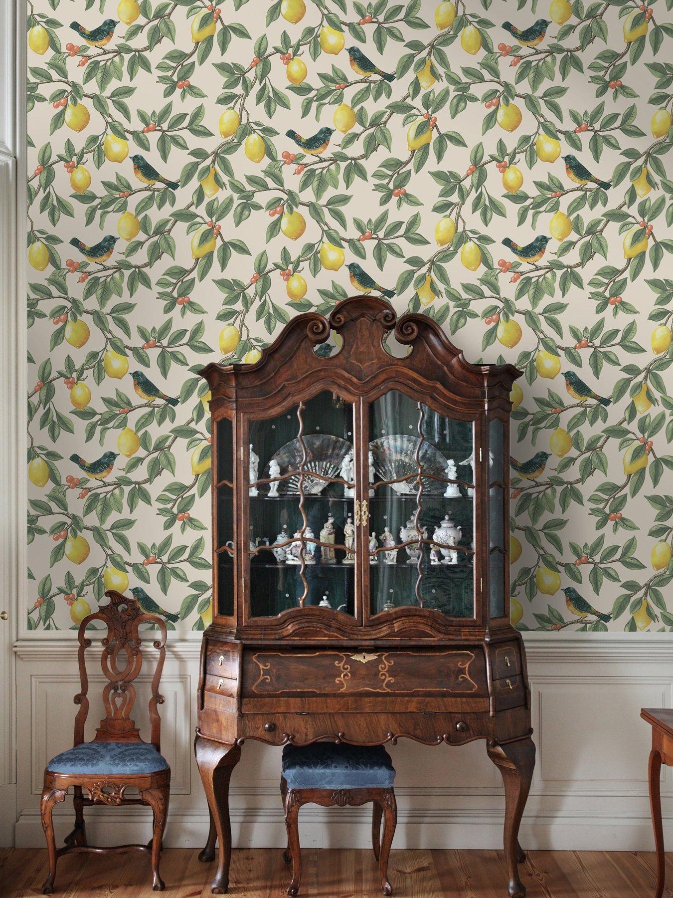 A beautifully painted lemon trail, consisting of branches adorned with lush green leaves, interspersed with berries and golden lemons. Nestled among the design are birds perched on the branches, blending classic and contemporary features on this playful wallpaper.