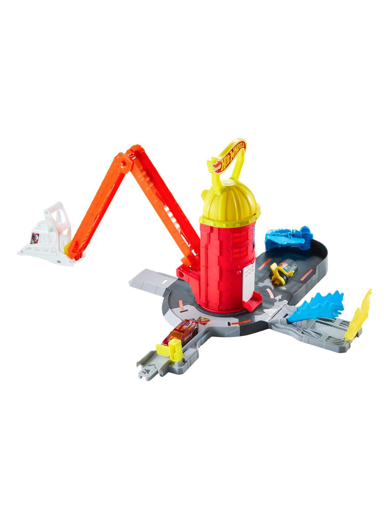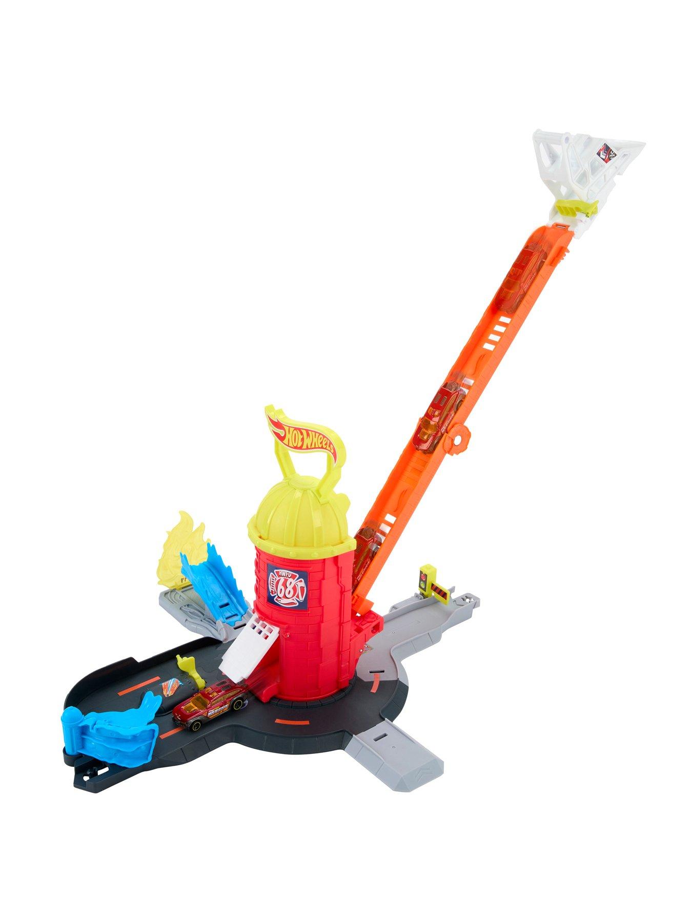 Drive into the carport and extend the firehouse ladder to create a 16" gravity drop. Choose 1 of 4 different exits: speed through a stoplight flipper, conquer a jump to put out a fire, visit the hydrant and water hose to reload, or speed off-site to save the day!
