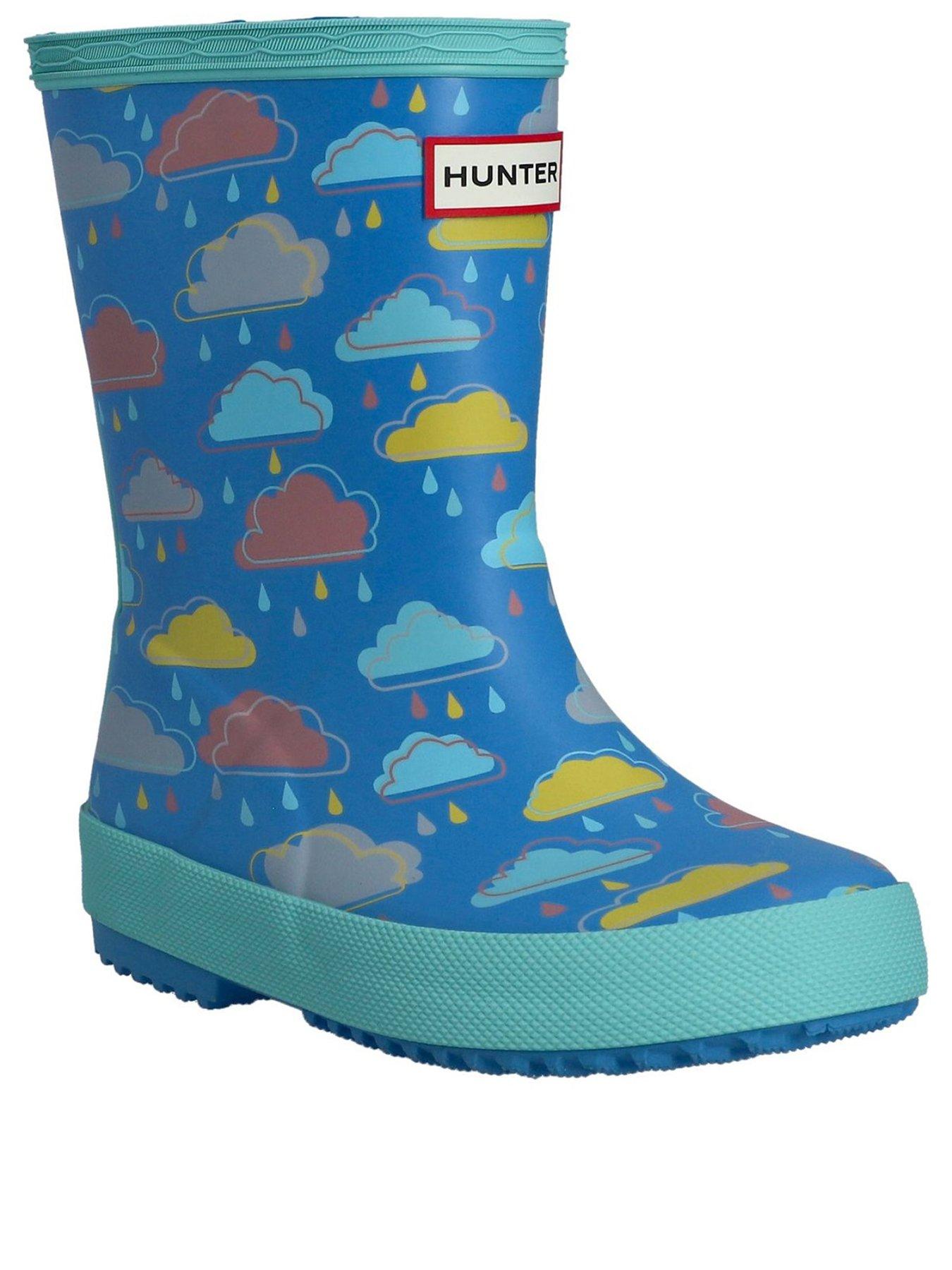 Hunter Kids First Rain Cloud Print BootThe Kids First Classic Rain Boot has been updated with a fun rain cloud print and is perfect for puddle splashing. Handcrafted from natural rubber, a flat sole and rounded toe gives little feet room to move.