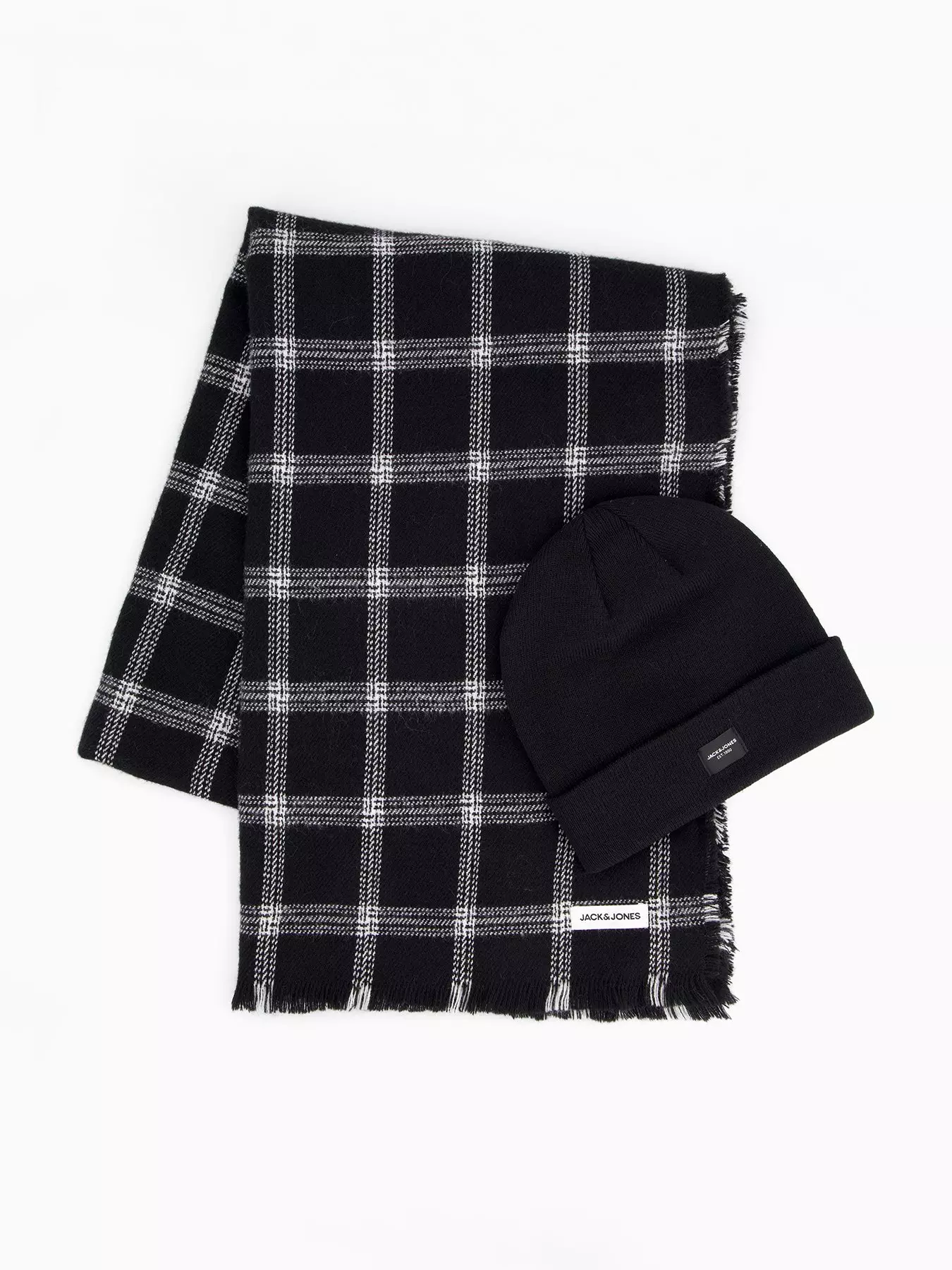 Jack & JonesFrost Beanie Hat And Check Scarf Gift Set - Black